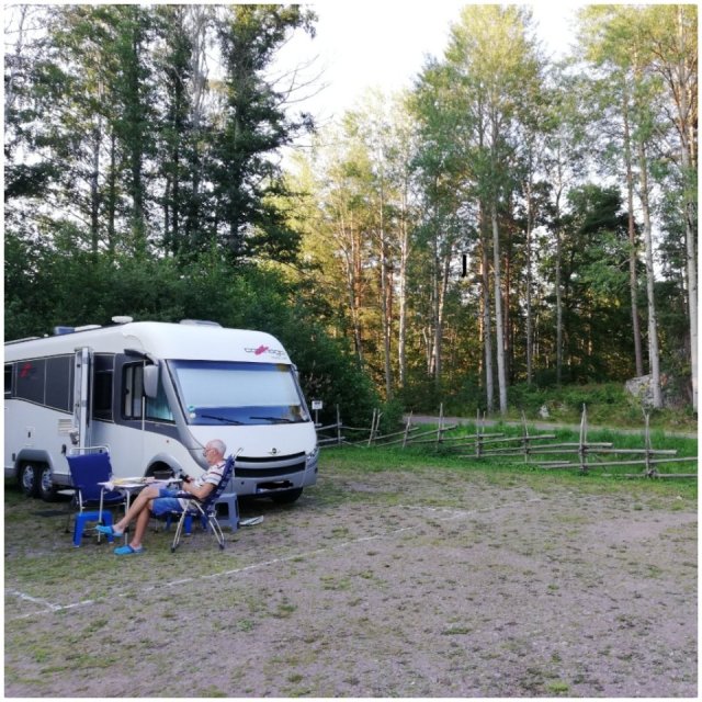 Strax nedanför ställplatsen finns sjön Sommen. Här kan vi bada och ha det skönt i kvällssolen. 3-400 m längre bort ligger Torpöns Färjeläge. Där kan vi köpa glass och god mat. Jag har varit här med jobbet nån gång och maten är verkligen god. Vi får se om det blir ett besök där i morgon, för här stannar vi hela helgen och bara njuter av lugn och ro.