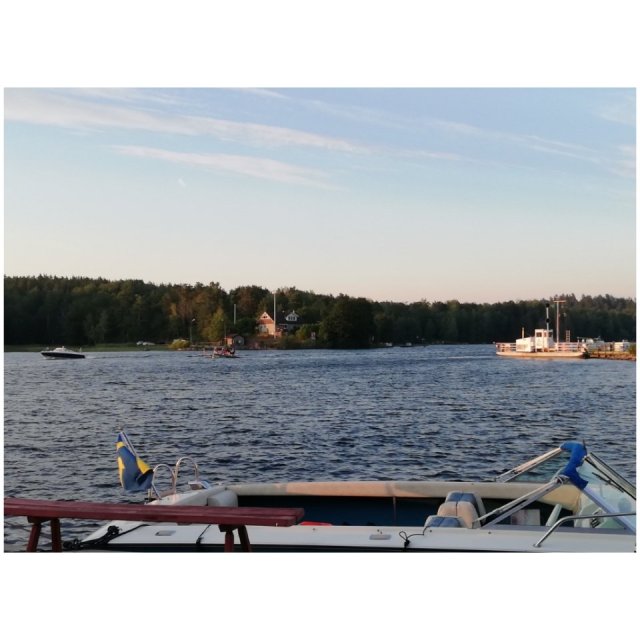 Vi tog det lungt i morse. Äntligen har jag sovit riktigt gott Men så är det ju i husbilen. En sover (nästan) alltid riktigt gott. Frukost ute. Bad. Solsken. Värme. Bad igen. Bra bok. Vi flyttade oss lite i sidled, när vi blev själva på ställplatsen. Vi står därför ”närmast” sjön. Sedan fick vi sällskap av en liten Adria Twin