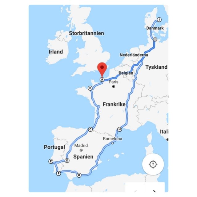 Vi sitter här och planerar lite inför vår andra övervintringsresa. Vi åker nog lite tidigare i år än i fjol, då vi åkte andra v i oktober. Vi tänker att vi ska passa på att åka Landstigningskusten i år när det är jubileum. Vi kanske börjar i Étretat och följer kusten neråt. Sen är det ju som alltid att väder och vind får styra. Vi kanske får nåt tips, som gör att vi ändrar på det vi tänkt oss. Det enda vi vet säkert idag är att vi ska vara i Torre del Mar, ö om Málaga, den 1 december för ett longstay på kanske 2 månader. Eller 3. Eller 1. Samma sak där – väder, vind och upptäckarlusta får styra. I grova drag har vi tänkt oss nedanstående rutt.