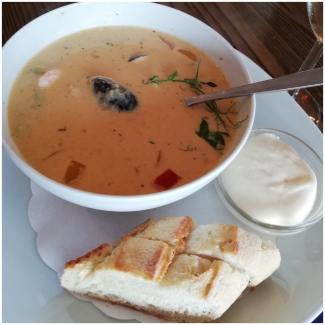Senare på lördagen kom husvagnskompisar på besök. De stod på camping i Borgholm så de tog personbilen upp till oss. Vi besökte restaurangen tillsammans och vi åt den magiskt goda fisksoppan. Det har nu blivit en tradition – en gång per år (minst) är ett besök här i Kårehamn ett måste 🙂 Vi fick veta att det är 24 ingredienser i soppan och då förstår jag varför den är så god. Dock fick jag inte veta vilka….