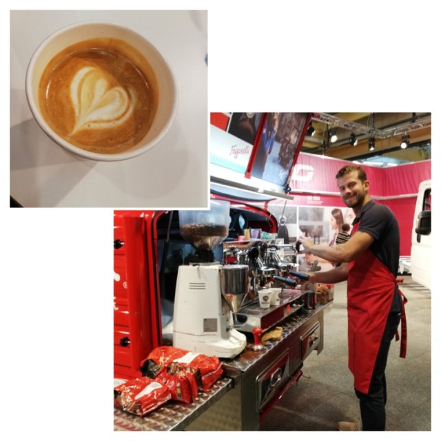 Efter lunchen måste ju förstås bli en kopp cappucino. I Fiats monter bjuder de på Fogarolli-kaffe, från den lilla söta ”Kaffebilen” Tack det var gott.