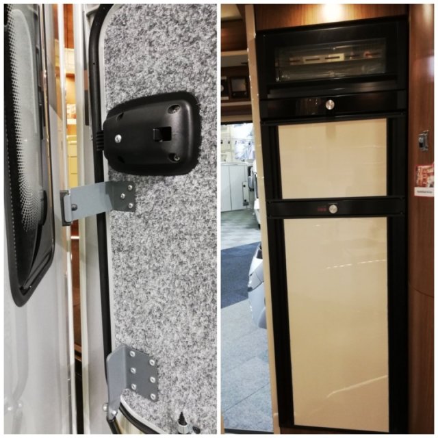 Sen har det ju smarta lösningar också. För att inte slå i bodelsdörren, om lastluckan precis bredvid står öppen har de monterat på ett vinkeljärn med gummistopp. Smart. Sedan är det ju också trevligt att kunna öppna kör och frys, både från vänster och höger. Dometics nya skåp, finns i flera bilar. Men det gillar jag.