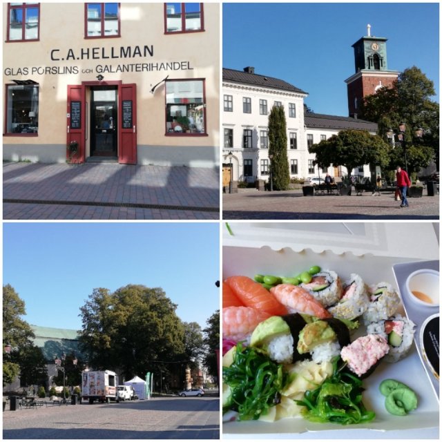 En dag for vi ner till Nyköping och knallade runt på stan lite.Det blåste kallt, så vi försökte hålla oss i de gränder som gav lä. Då var det skapligt skönt. Innan vi for hemåt, så passade vi på att köpa med oss lite sushi från Sushi Yama. Vi har ätit där för nåt år sedan och varit väldigt nöjda. Nu var det tyvärr ett bottennapp. Så synd att vi tog med hem och inte åt på plats, för då hade de fått göra om alltihopa. Sega. Svampiga och torra så jag kunnat lekt studsboll med dem. Bläsch….. 😦