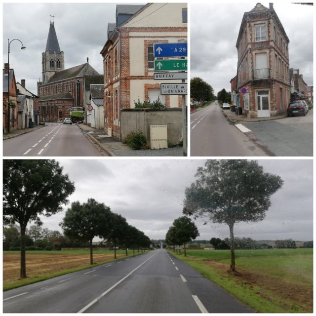 Vi lämnade Avion efter frukost, i regnväder. Vi for mot sydväst eftersom vi hade knappat in GPSen på Étretat. Det ligger precis vid Atlantkusten. Vi for genom jordbrukslandskap och genom byar. Även om vi hade störtegn och rejäl vind emellanåt, så har de gråbruna byarna sin charm ändå.