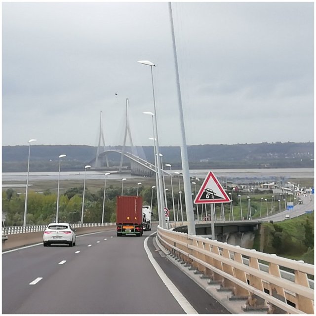 Nästa anhalt blev Honfleur. Vi har hört och läst om denna lilla staden och vi ville se hur det såg ut här. När vi knappade in GPSen frågade ”Astrid” om vi ville köra betalväg eller inte. Gratis vägen blev lite drygt 8 mil och betalvägen ca 4. Det enda som kostade på betalvägen var denna häftiga bro som vi fick ge 6.30€ för att passera.
