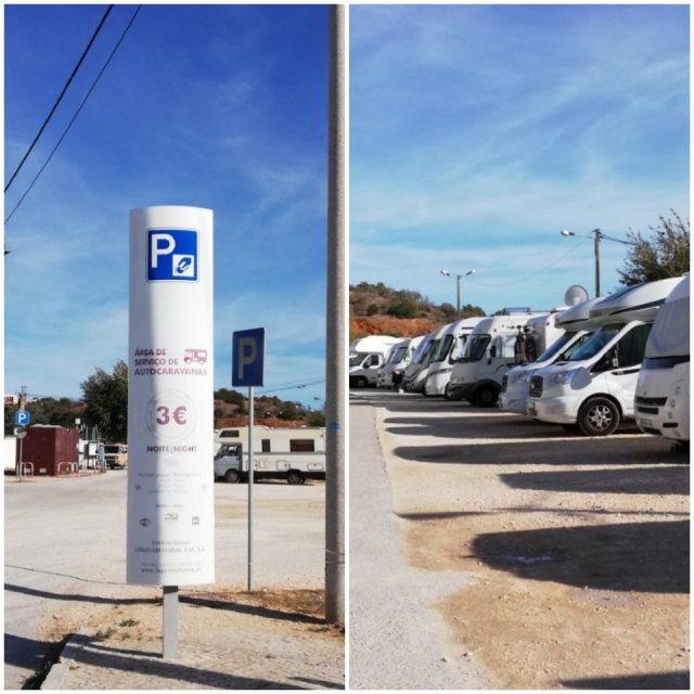 Framme på ställplatsen i Lagos, parkerade vi. En synnerligen trist plats, men vad får man för 3 € N37.115695,W 8.678544. Här finns möjlighet till tömning. Vatten, dusch och tvätt/torkmaskin kostar extra. Ett halvsvajigt wifi finns.