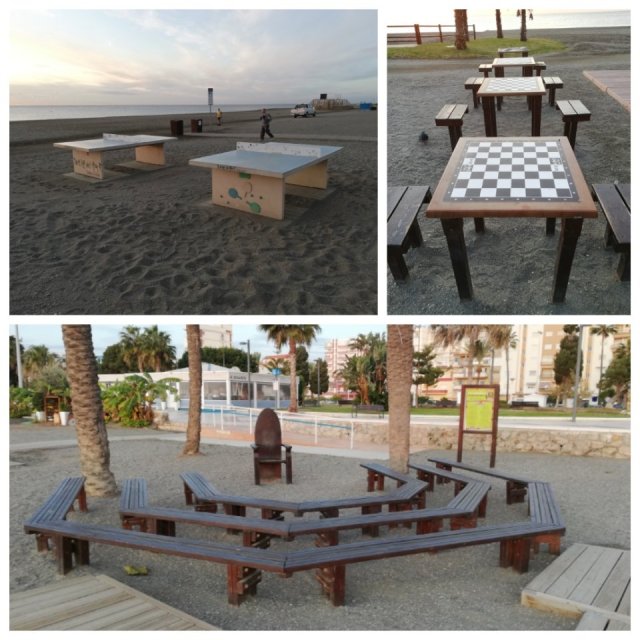 Vid ”Playa Bilioteca” finns bänkar att sitta på när nån sitter och högläser. Ett par pingisbord och några schackbord finns också numera.