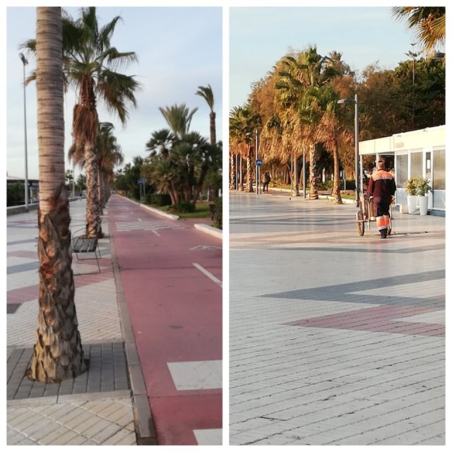 Cyklister och promenerare hålls åtskilda. En renhållningsarbetare går med sin vagn och tömmer sopkorgar och plockar upp om nåt ligger på marken.