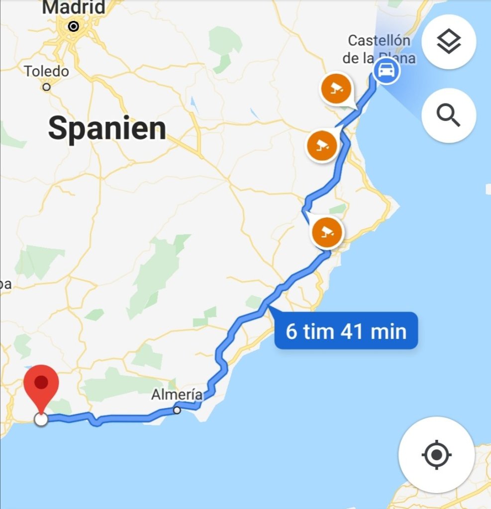 Idag blev det 70 mil, hit till Benicassim. Koordinater N40.013890, W0.036526 Här stod vi en natt i fjol också. Då pajade vårt kretskort till Aldepannan. I år får det hålla! Du får också gärna hålla en tumme så vi kan ta oss hem utan stillestånd och missöden ❤️