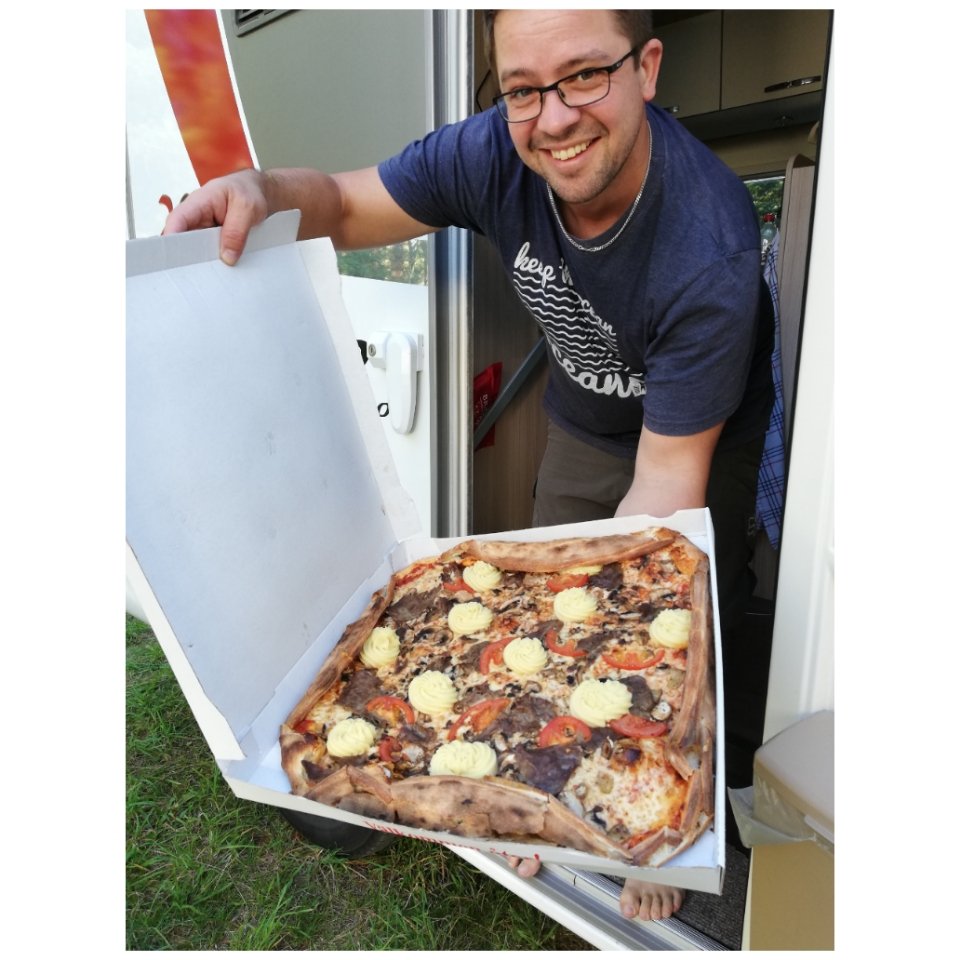 När vi kom, mötte vi våra vänner Annika och Mini, resebloggarna Finnaly lost Traveling, på en ställplats/parkering i ena änden av stan. Så roligt att ses igen. Och naturligtvis finns det hur mycket som helst att prata om. Så roligt att ingen av oss hade lust att laga mat. De kom med förslaget om att dela en Åhus special. En speciell pizza med potatismos och kött på. Jättegott!