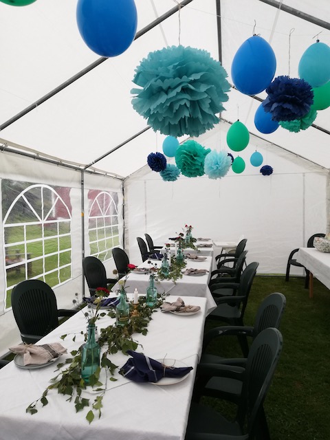 Fint. Blev extra glad åt att se de rejäla och därmed hänsynsfulla avstånden mellan stolarna, i det smakfullt pyntade tältet.
