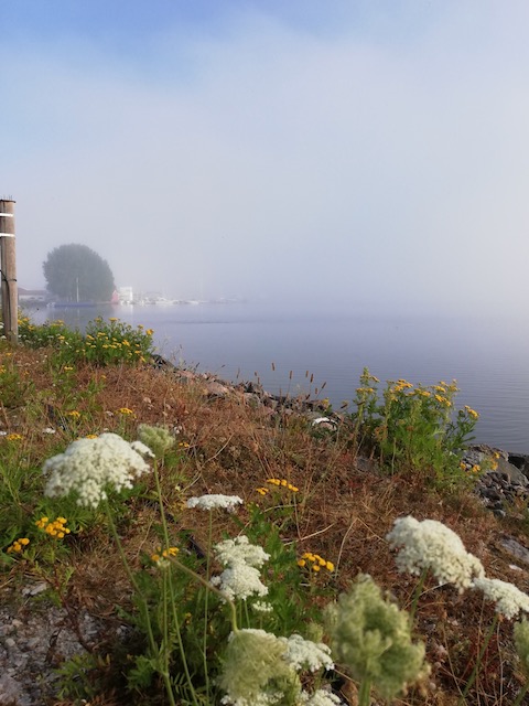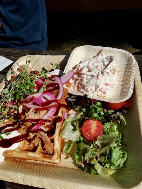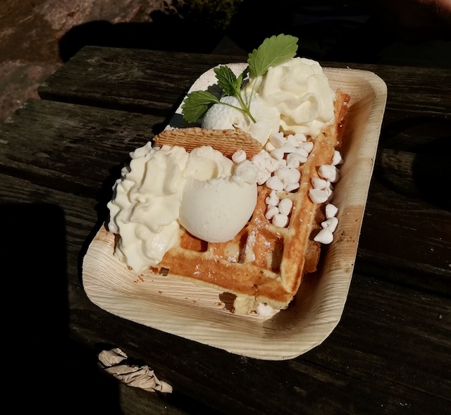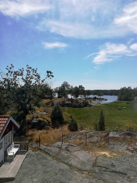 Sedan var det dags för ett besök hos barn och barnbarn i Gnesta. Det blev poolhäng och sandstrand eftersom det var så varmt dessa dagar. Vi orkade dock iväg till Oxelösund och Femöre, en dag. Lunchen skulle intas på Skärgårdsvåfflan. Här finns det våfflor med många olika sorters pålägg. Vi valde räkor och nån annan valde pulled chicken. Och så klart – glass.