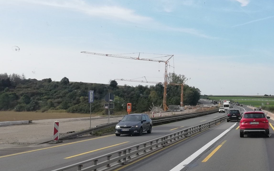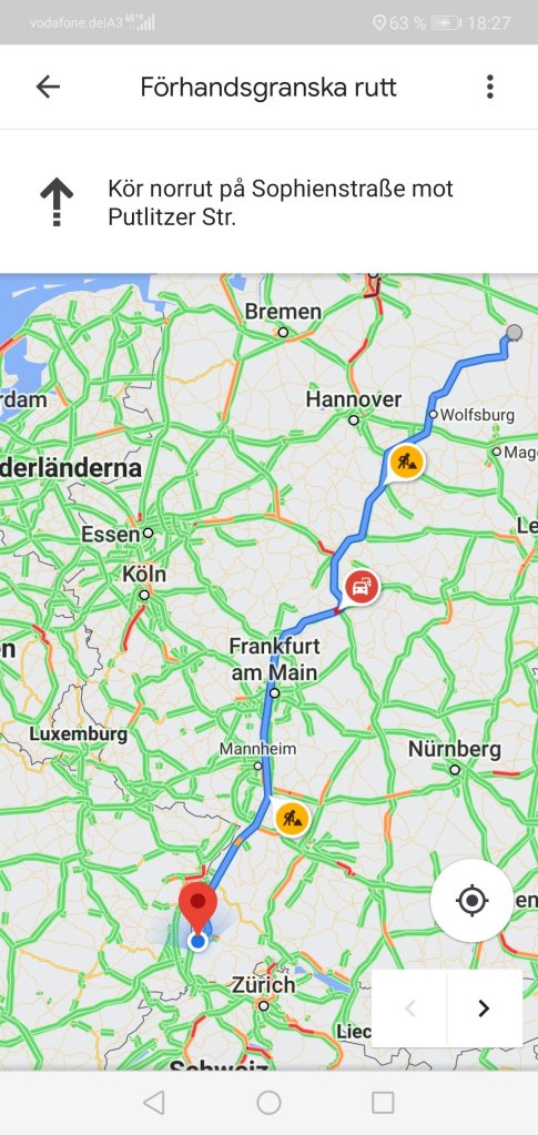 Vi kom ut på autobahn A39, vid Wolfsburg. Strax därefter kom vi på A7 och den följde vi. Ungefär vid Bockenem var det ett 3 mil långt vägarbete. Även på A5, vid Giessen, samt s om Manheim (vid avfart 39) och s om Karlsruhe var det gigantiska vägarbeten. För oss flöt det på hyfsat bra men skulle inte vilja hamna där en vardag 😮