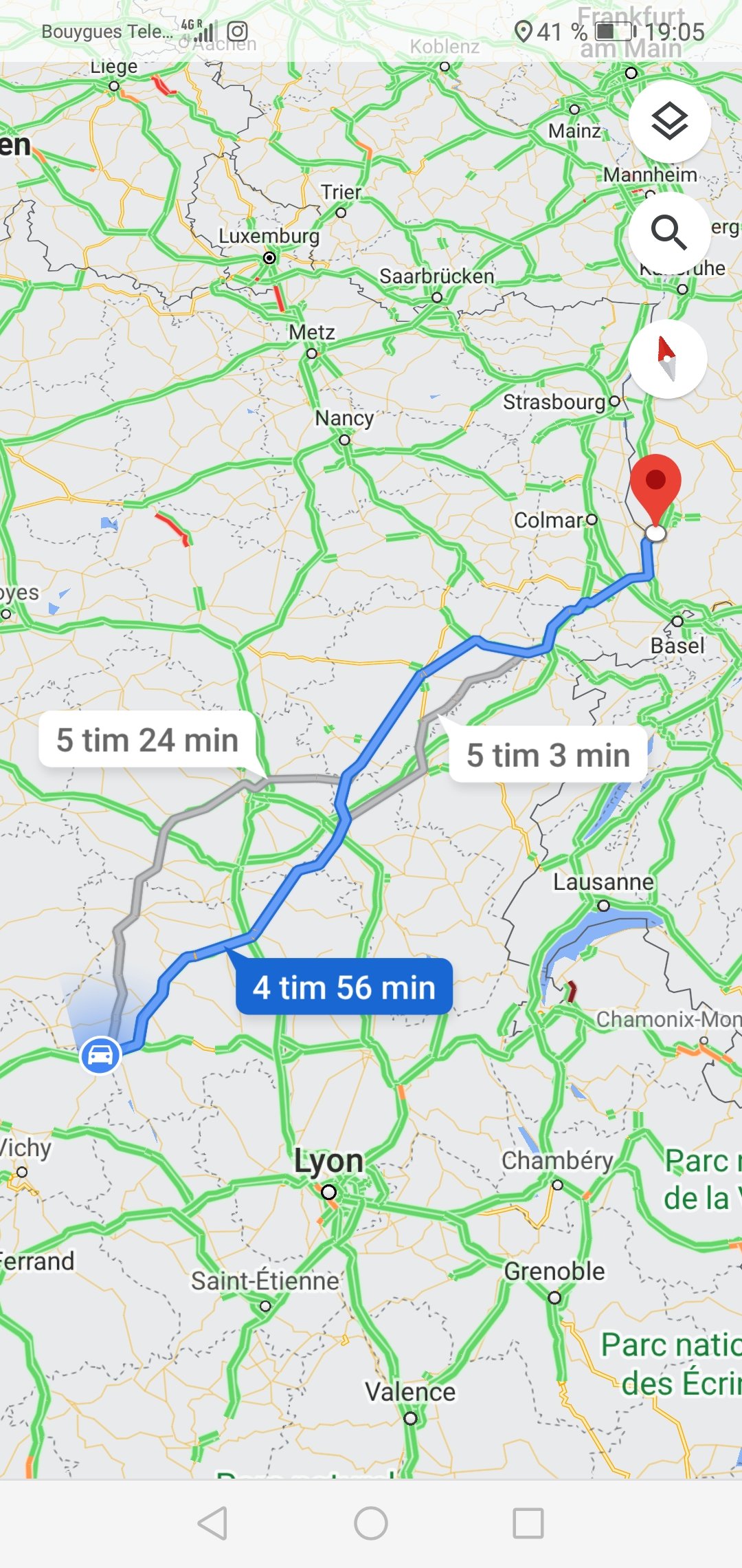 I morse fick vi faktiskt ner temperaturen till +22 i sovrummet så då kändes det nästan svalt när vi vaknade. Det blev en sovmorgon och vi kom iväg strax före 8.30 Knappade in GPSen på betalfri väg till Digoin, i Frankrike. Vi hade ganska precis 40 mil att köra idag. Det var bra väg och många mil motortrafikleder. Vi passerade Mulhouse, Vesoul, Dole, Chalon-sur-Saóne, Montchanin och Gueugnon. Den sista orten hamnade vi i, eftersom N70 var avstängd. När vi kom till Digoin körde vi till det ”nya” handelsområdet där vi tankade på Intermarchee tank för 1.156 /lit Vi var också in på intermarchee och handlade lite franska godbitar. Här i Frankrike är det munskydd på, när man går in nånstans. Överallt finns det tillgång till handsprit.