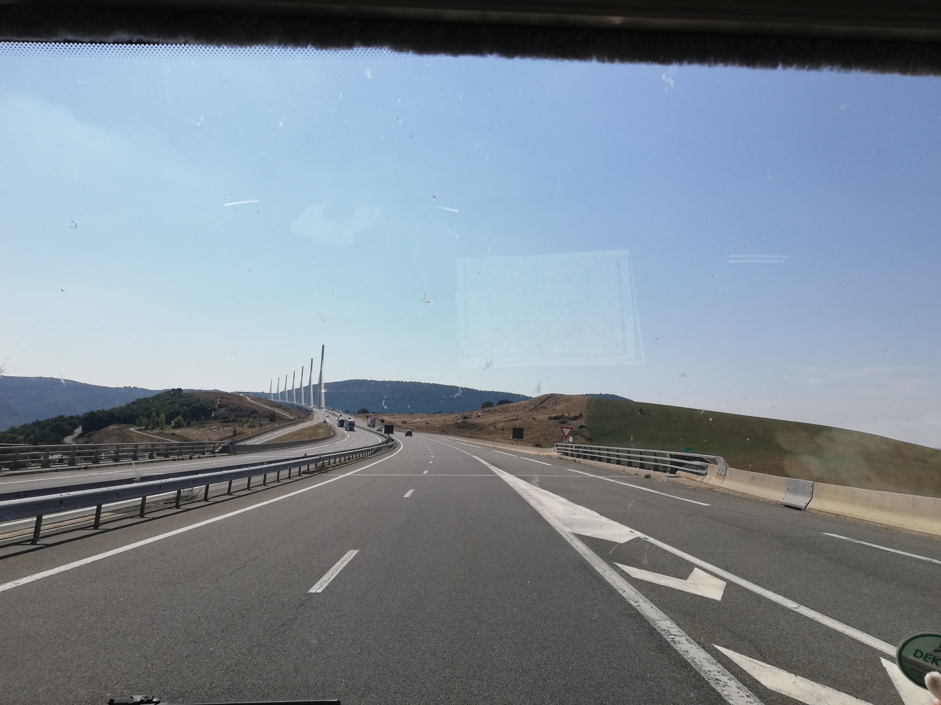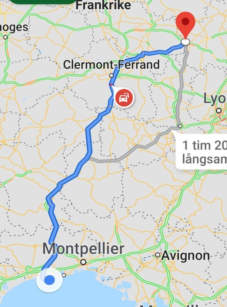 Efter en tropisk natt i Molinet styrde vi mot Medelhavet. Vi hade bestämt att nu är det dags för lite vila och bad. Färden gick som vanligt på betalfria vägar. Det rullade på jättebra tills vi kom en bra bit s om Clermont-Frerrand. Där var det helt plötsligt avstängt, så vi fick ge oss av på några småvägar. Vet inte riktigt vart vi for, men vi hängde på en fransk långtradare och tänkte ”kommer han fram gör vi det också” Efter ett tag hade han kört ifrån oss… Vi kom dock tillbaka upp på A75 och sedan rullade det på fint.
