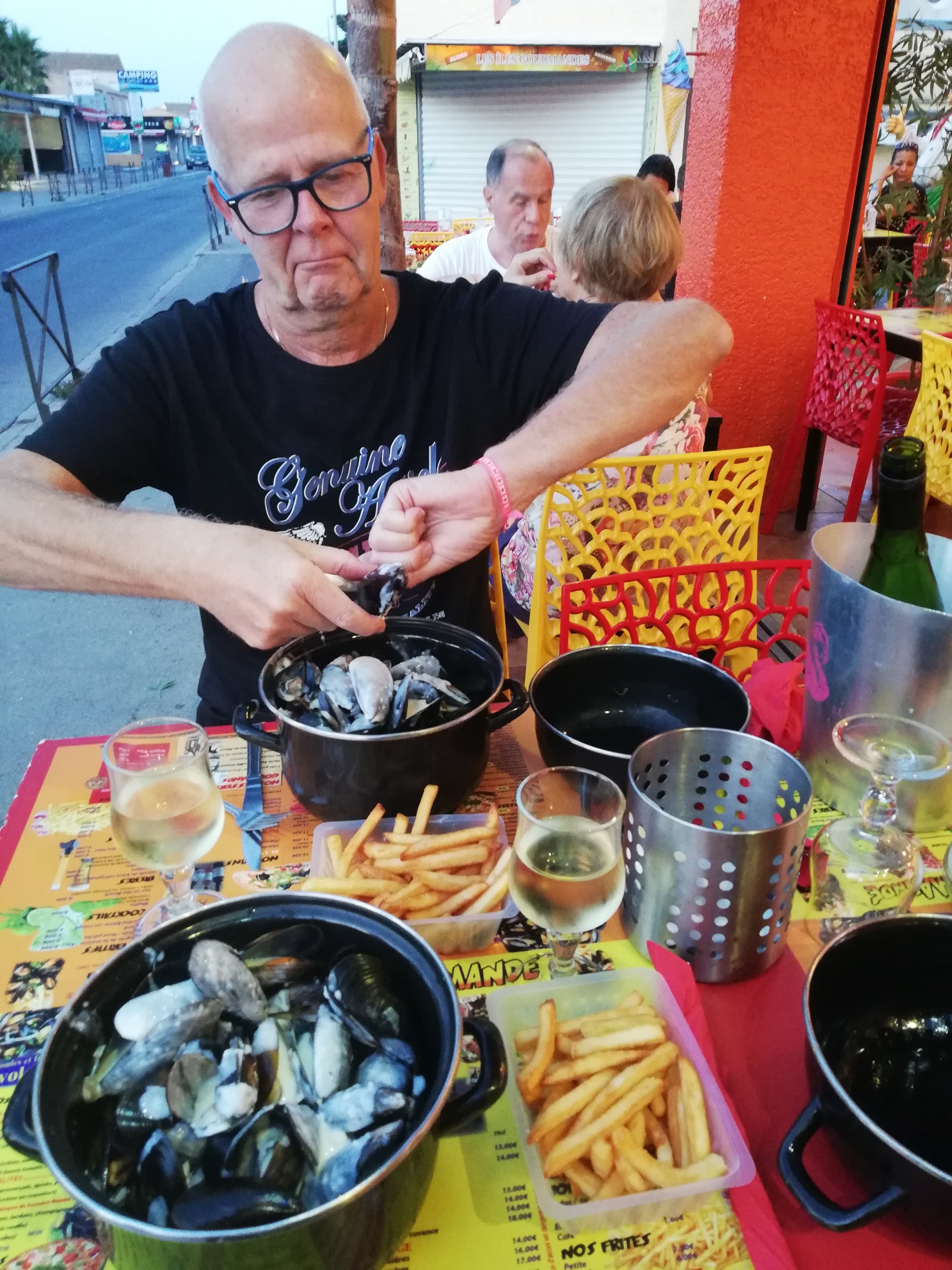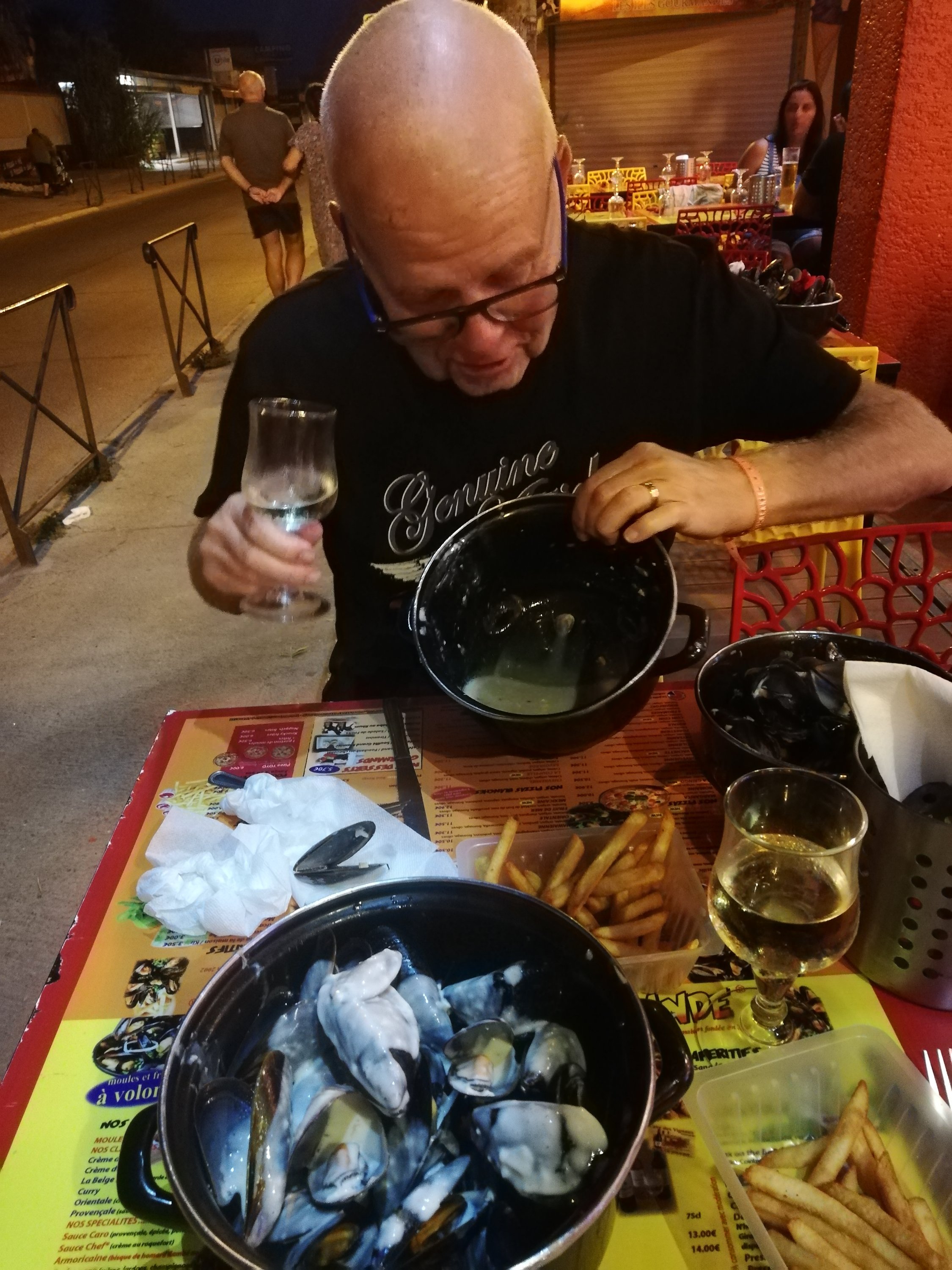 Igår kväll gick vi till restaurangen Le Moule Gormand Där åt vi nykokta musslor med vitlökscreme. Så makalöst gott. Under musslorna, på menyn stod ”à volonté” Vi tänkte inte så mycket på det, men ganska snart fick vi klart för oss att det betyder att man kan hämta påfyllning. Igen och igen och igen. Eftersom det var så gott, gjorde vi så klart det. Och jag tror vi delade på totalt 3.5 kilo 😊 Det var helt otroligt gott 😋