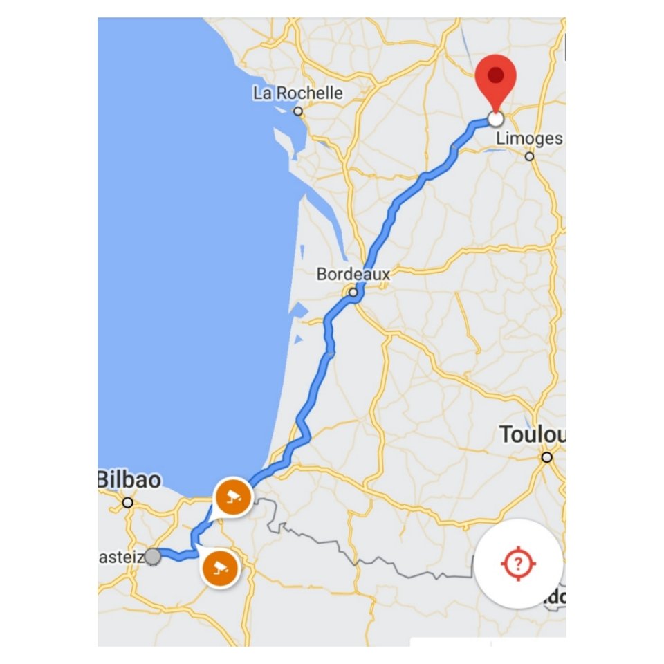 Denna gång väljer både ”Astrid” och ”Janzon” (Gps och Sygic) en smartare och bättre väg genom San Sebastian. Det blir dock lite mera kärvt när vi ska passera förbi vid backarna och rödljusen i Saint-Jean-de-Luz. Vi är ganska rejält tungt lastade för vi hjälper våra vänner som sålt sitt hus i Torrox, att transportera hem några flyttådor. Och vi ställde alla bak i garaget. Resultatet blev att vi slirade och knappt kom i gång när vi stannat för rödljus, i uppförsbacke. Asfalten var våt och vi baktunga. Vi fick därför stanna och packa om lite, så en flyttkartong fick flytta in och då blev det något jämnare viktfördelning och vi spann inte mera.