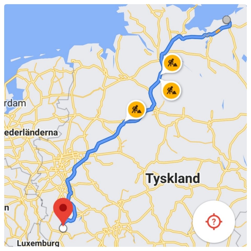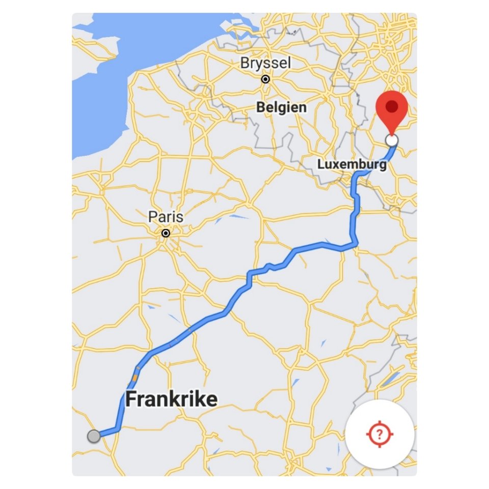 Onsdagen den 17/3 fortsätter vi och vi har lite funderingar på hur långt vi verkligen kommer denna dag. Vi väljer ju som sagt, inte betalvägar. Och det tar tid genom byar och genom rondeller. Det vet vi av mångårig erfarenhet. Men när vi nu väljer destination så hamnar vi på helt perfekta vägar. Visst kan nåt avsnitt vara lite smalare och lite krokigare. Men det är mest breda, raka vägar och inte så backigt. Vilket gör att vi kan hålla en jämn lunk. Landskapet är idag grått och trist och det kommer lite regn emellanåt. Vete 17 om det inte är lite snöblandat också, på ett ställe. Vi tankar – så klart – i Luxemburg och fortsätta sedan över gränsen. När vi får ”välkommen till Tyskland”-smset, kommer nästan samtidigt ett sms från ”Die Bundesregierung” där de skriver om vilka regler som gäller i Tyskland. Vi vill inte sitta i karantän under 5 dagar, därför har vi 24 timmar på oss att lämna landet.