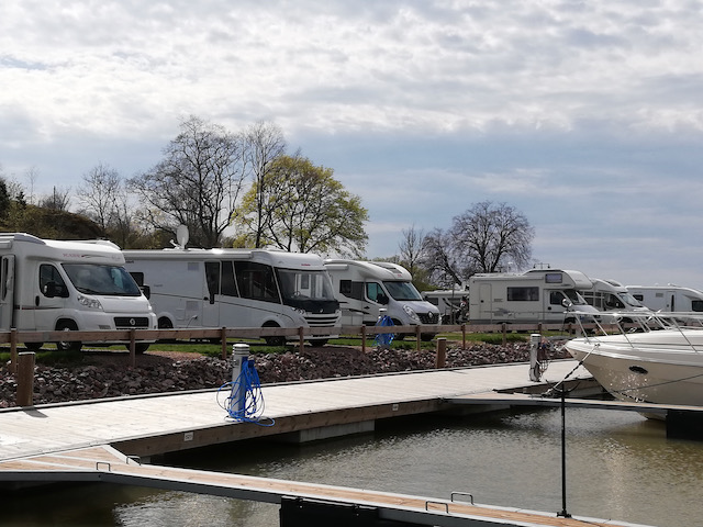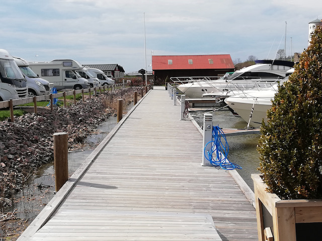 Det är väldigt välordnat här och man parkerar sin husbil på grus, enligt anvisning. Det finns en gräsplätt mellan alla tomter. Bra servicehus en bit bort och man håller på att ordna med tömning av grå-svartvatten vid infarten till själva båthamns-området. Man håller på att ställa i ordning en toalett-tanks-rengörinngsmaskin som ska vara klar nu i maj. Fyllning av vatten finns på tomterna, då det finns kranar där. El finns till varje plats och det är inkluderat i priset. När vi var där betalade vi 200 kr/natt men det varierar beroende på säsong och vart nånstans på området man står. In och utcheckning är kl 12.00
