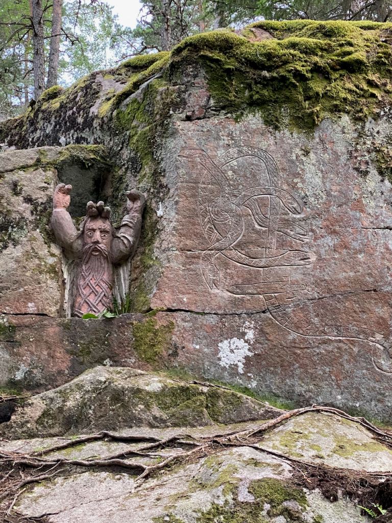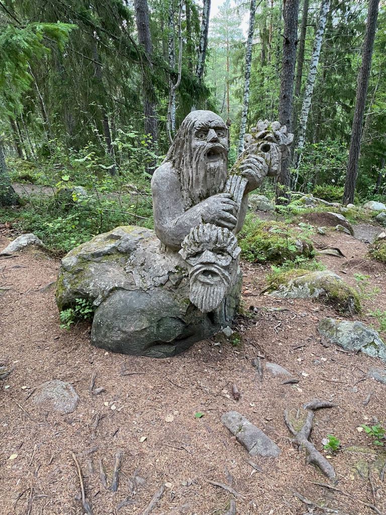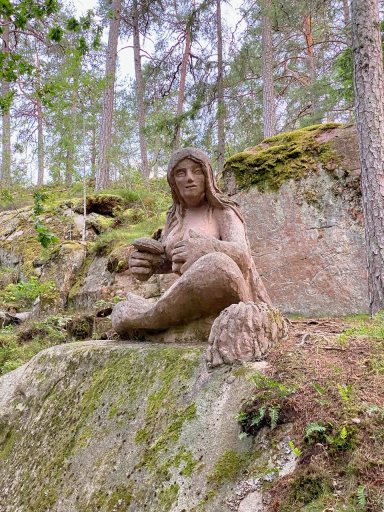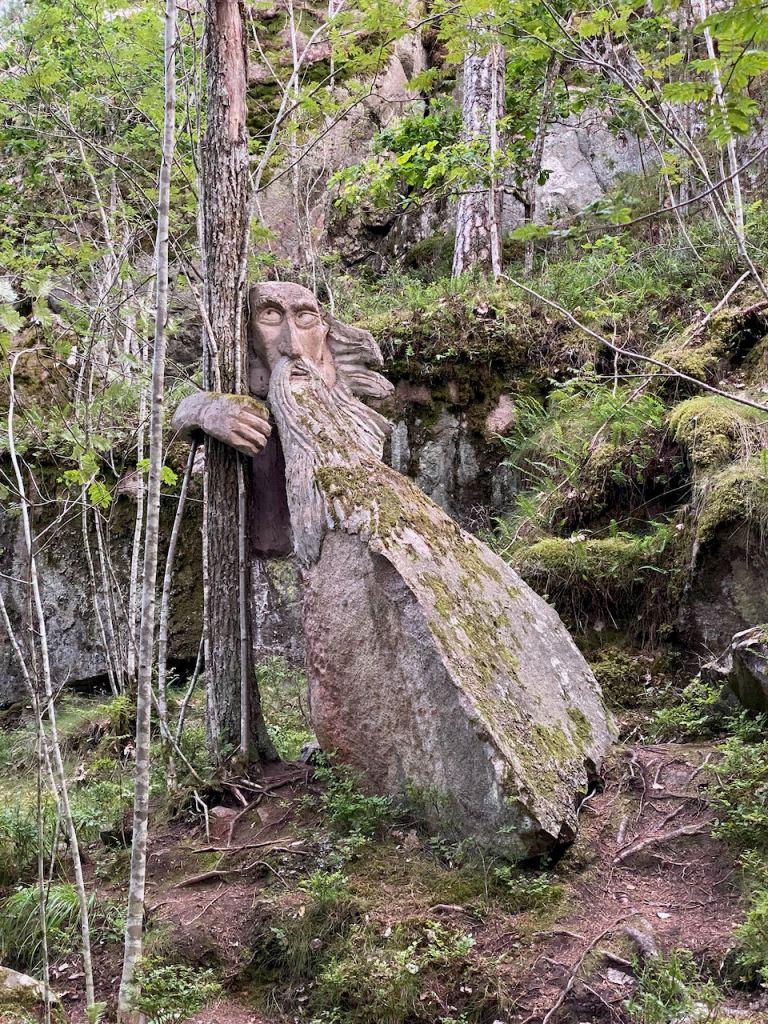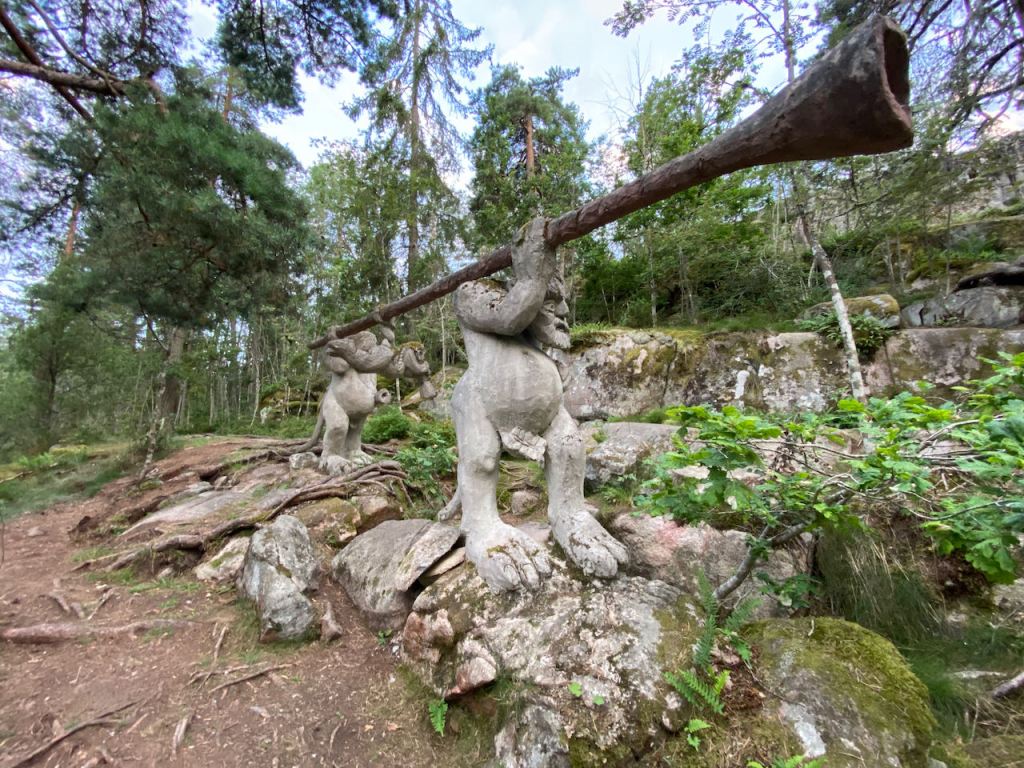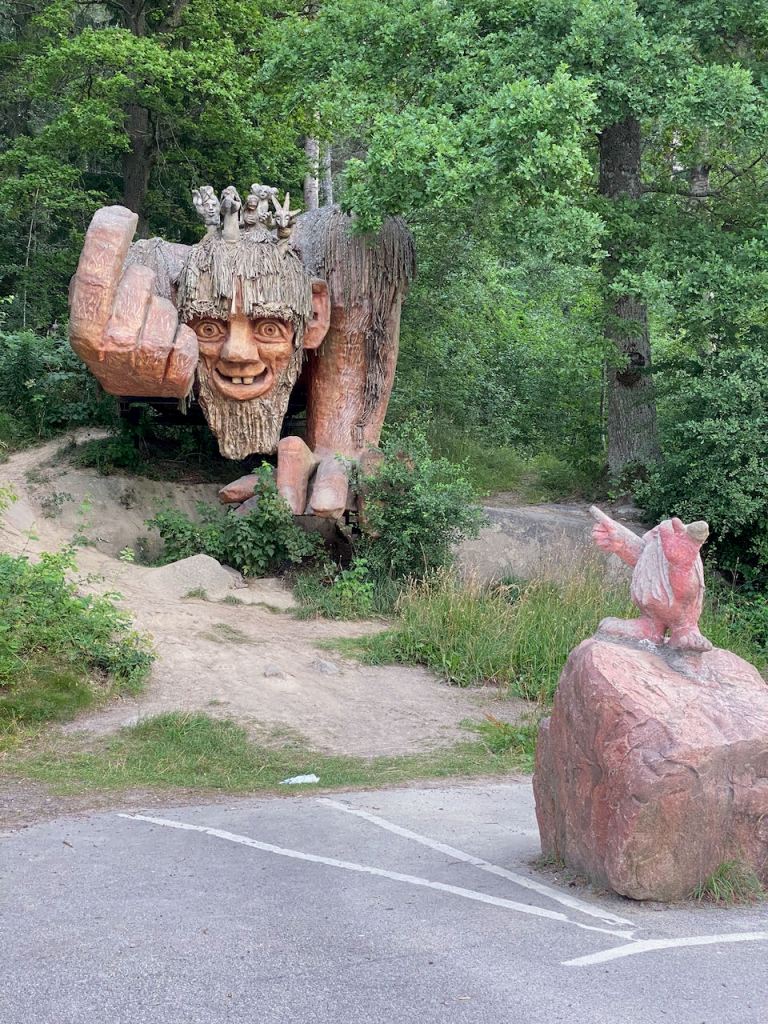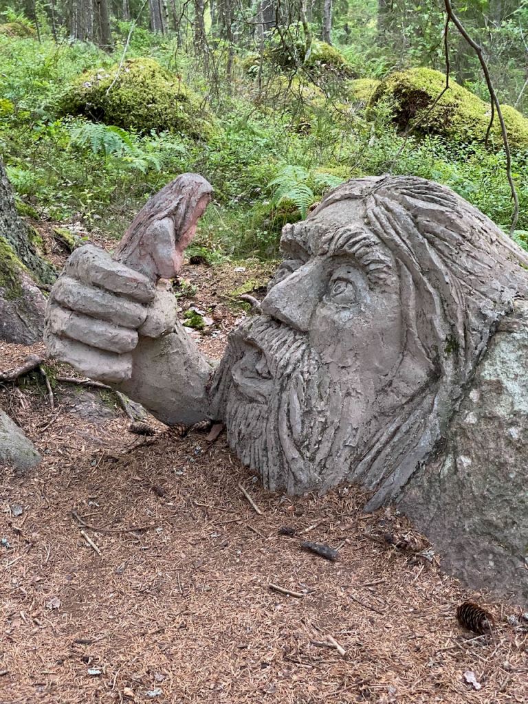 Det var en ganska rejäl uppförsbacke, upp på Garpedans-berget. Men när vi kommit upp såg vi jätten och hans 70 kamrater, däruppe. Numera är alla förstenade, i fiberbetong. Och de är gjorda av konstnären Jan Pol. En trevlig vandring, genom skulpturparken i Gamleby. Och en trevligt sak till – det går alldeles utmärkt att övernatta med husbilen på parkeringen.
