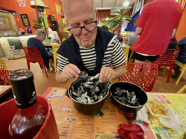 Vi vile ju naturligtvis också äta musslor. Därför gick vi iväg till La Moule Gourmand En restaurang i stan. Vi har ätit där förrut och vet att det var bra där. Vid ingången måste vi visa vårt Covid-pass för att bli insläppta. Munskydd däremot verkar man inte vara så noga med. Jag väljer musslor i roquefortsås och Göran väljer aiolisås. Otroligt gott. Här är också lite kul för det heter à volonté och det betyder att man får påfyllning. Jag klämmer faktiskt 2 grytor. Och Göran 3 😀
