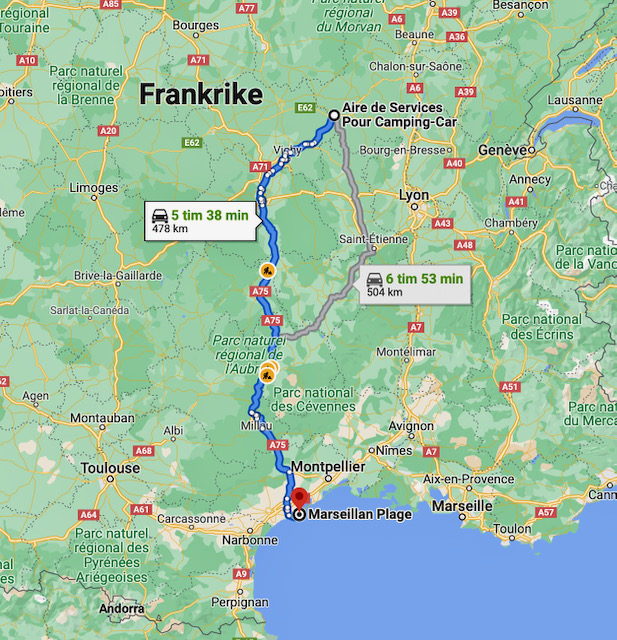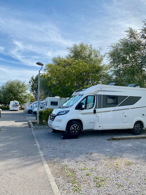 Vi stannar till ett par dagar på ställplatsen i Marseillan Plage. Ganska många husbilar är ute på rull och det är nog belagt till 75-80 % över helgen. Ställplatsen tror jag har 85 platser totalt, så den är stor. Vi letar skugga och kopplar av.