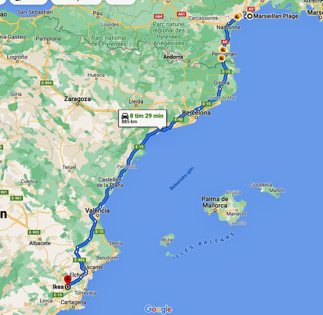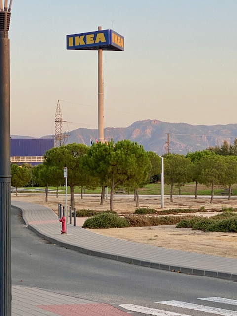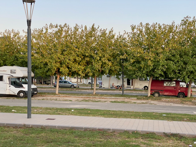 Att köra gratis motorväg är helt ok för oss 😊 Det var väldigt lite trafik ute, även kring Barcelona. Och i princip inte en endaste långtradare Vi kunde därför hålla en jämn och bra hastighet hela vägen fram till Murcia och ställplatsen på Ikeas parkering. Vi behövde ju fara till nåt bekant ställe eftersom vännerna hemma skickade sms med koordinaterna. Våra telefoner var ju avstängda för surf. Platserna för husbilar var under och bredvid träden så vi fick skugga vilket var skönt.