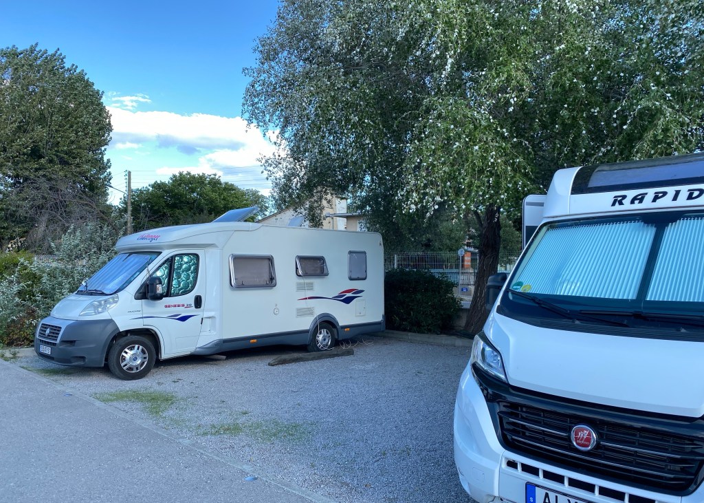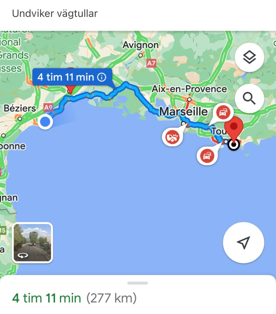 Vi lämnade ju campingen strax ö om Toulon, i morse. Vi har väl sovit så där, för vi har haft en tropisk natt i natt och det är vi ju inte van vid – än…. Vägen därifrån och hit tog oss 5.5 timme. Trots att vi faktiskt åkte betalväg en bit. Räknade ut att det kostade oss drygt 10kr/milen Och de pengarna prioriterar vi annat för. Så ca 28 mil tog alltså 5.5 timme