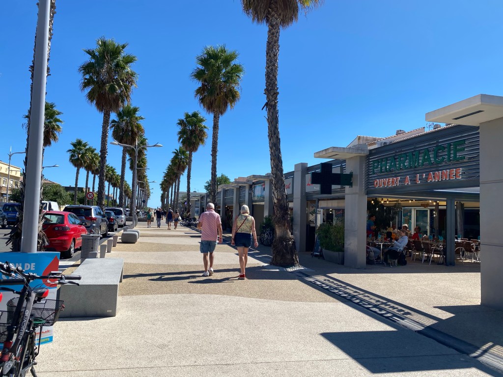 Vid lunchtid kom bloggvänner på besök. Vi har följt varandra på blogg och sociala medier i typ 10 år. Vi har varit nära att träffas men vi har inte riktigt fått till det. Förrän nu. De kom susande i personbil från sin franska by Murviel och vi hade bestämt att ta en lunch tillsammans. Och här i Marseillan-Plage är det väl nästan ett måste, med moules frites.