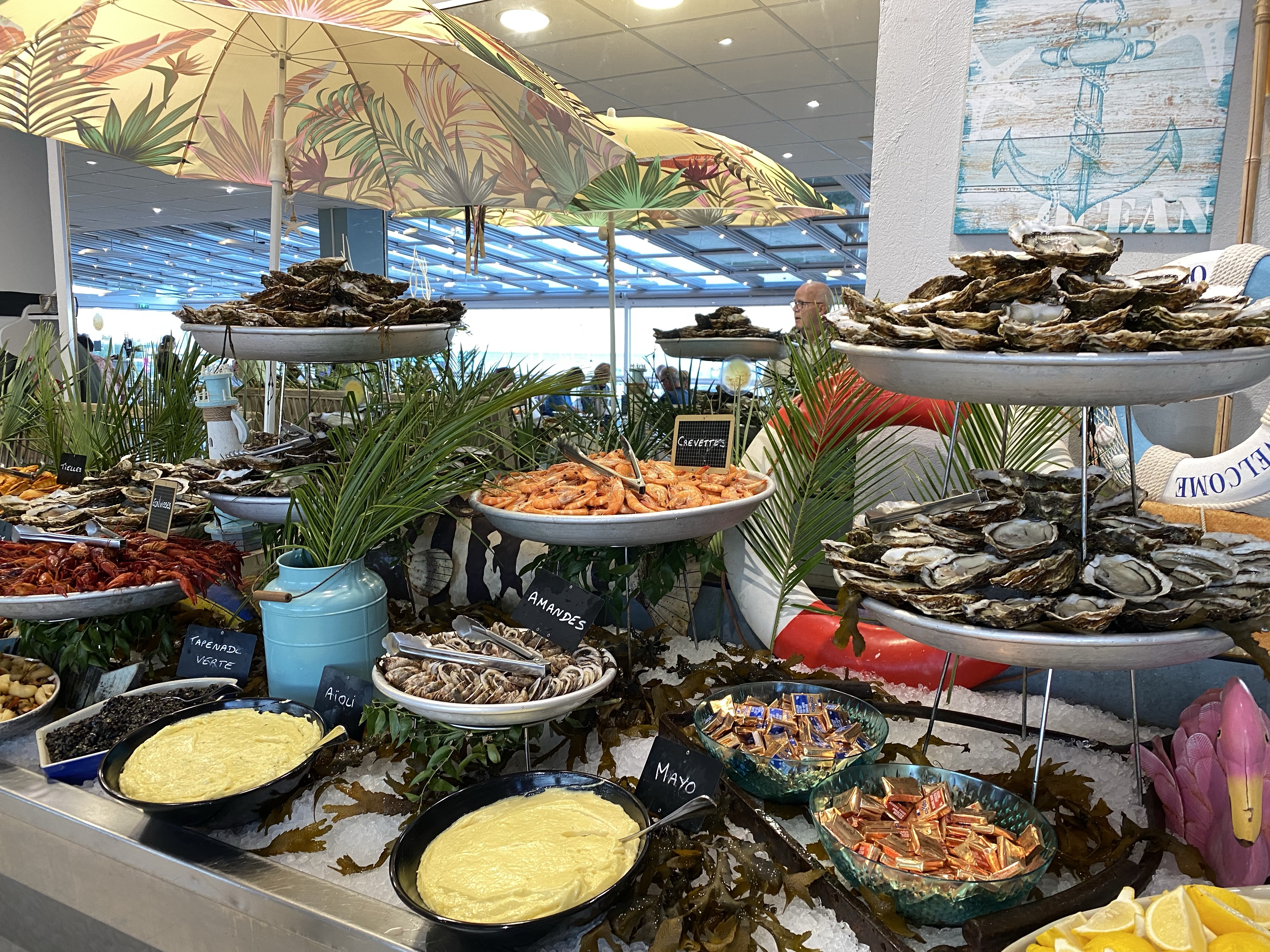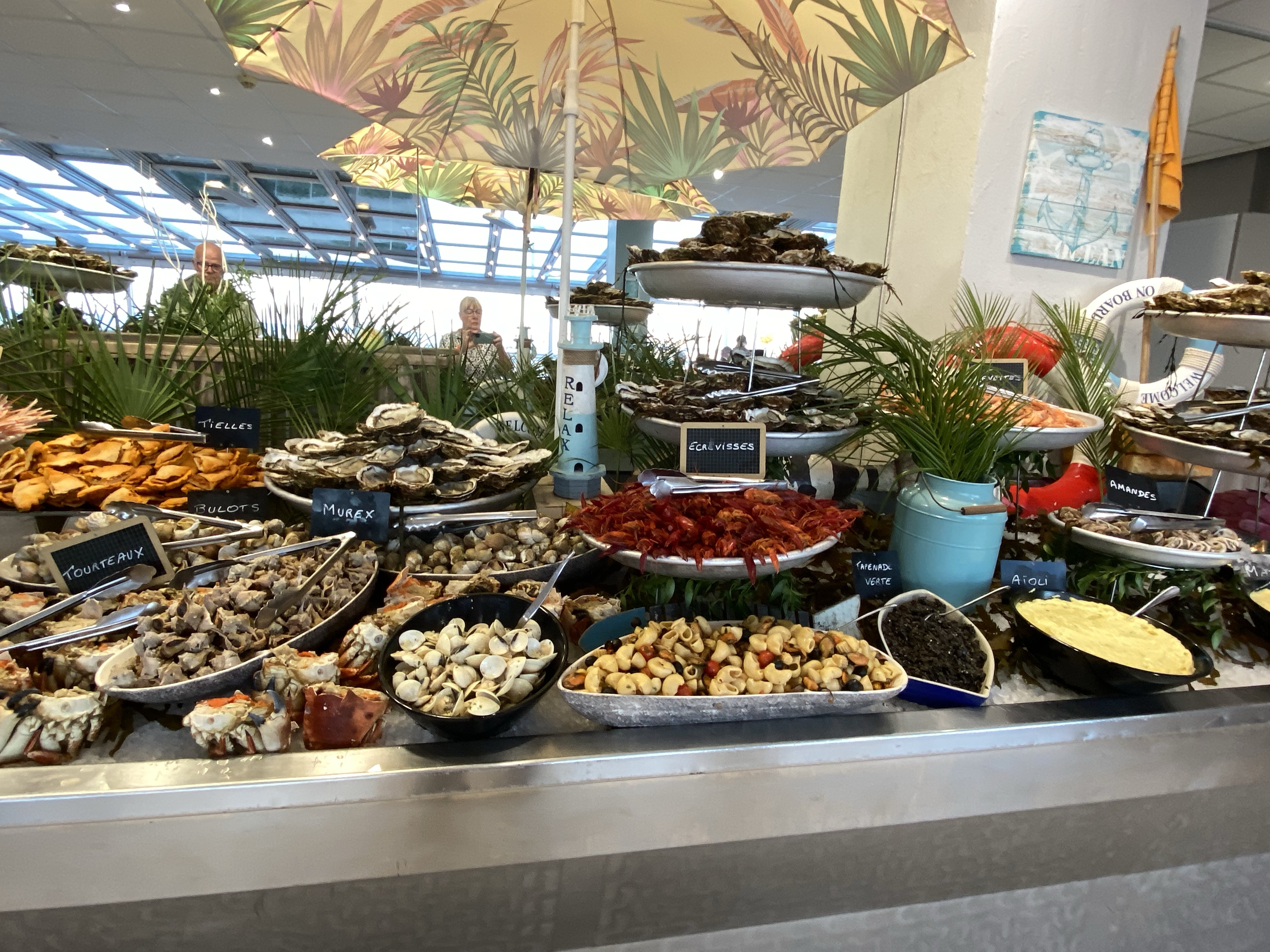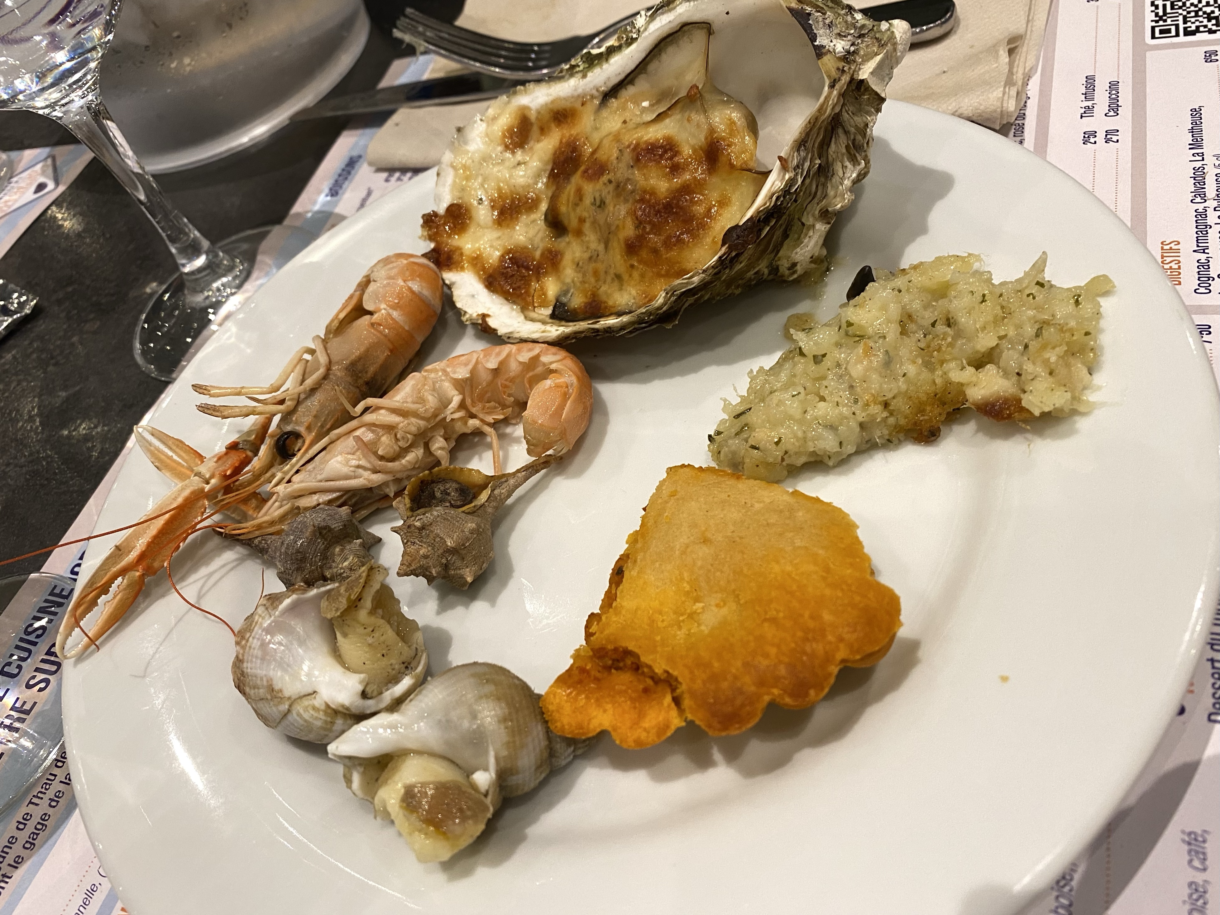 När vi kom hit igår eftermiddag, började jag googla på skaldjursrestauranger. Har du hängt med oss ett tag här på bloggen, kanske du vet att vi älskar fisk och skaldjur. Jag blev alldeles lycklig när jag hittade att La Ferme Marine (som vi ätit på inne i Marseillan) hade en typ filial här, på ett hotell i småbåtshamnen. Lyckades boka bord – det fanns 3 kvar! Så nu i kväll, har vi formligen frossat i skaldjur. 😍 Musslor. Snäckor i olika varianter. Sniglar. Krabba. Räkor. Languster. Kräftor. Sallader. Och ostron – de största och godaste jag någonsin ätit. Och allt är fräscht och färskt eftersom det fångats i etangen här utanför. Musslor och ostron fanns dessutom gratinerade. En helt underbar kväll om du frågar mej! Allt för 30.90€ /person Plus vin.