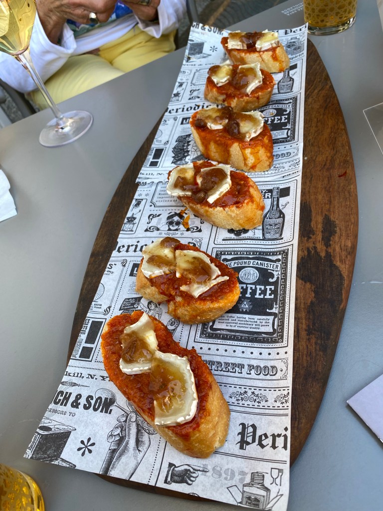 Det första stället vi besöker, har vi inte gästat tidigare. Det är Eria Gourmet. De serverar en Tapa med Sobrasada, chèvre toppat med fikonmarmelad. Sobrasada är en mallorkinsk ”krossad” smakrik korv. Chèvre är en getost. Brödet det ligger på har en bra krispighet och smakerna går fint ihop. Det smakar riktigt gott.