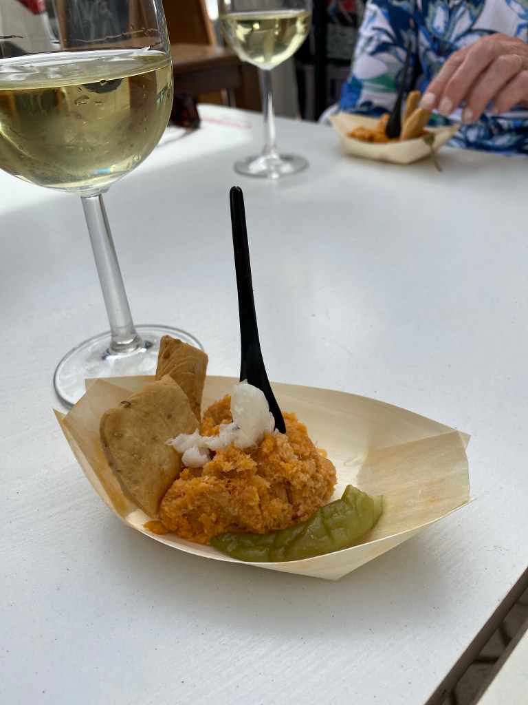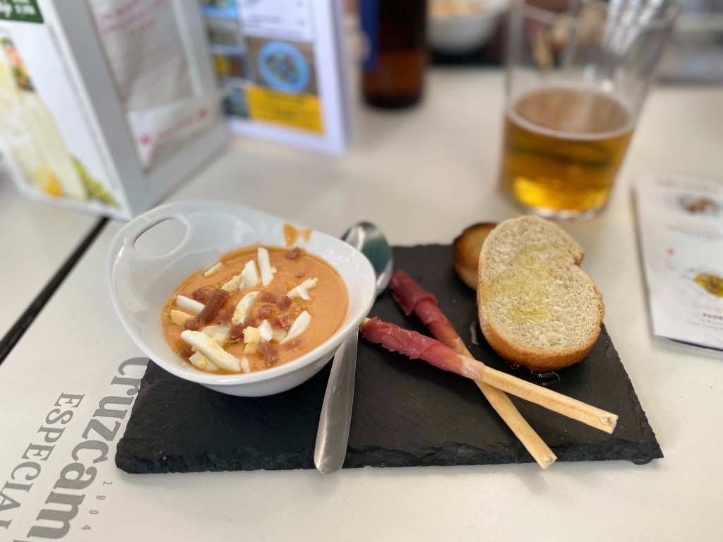 På Casa Manoli var det fullsatt så när som ett bord som vi fick. Där bjöds vi på en liten Salmorejo med smörstekt bröd och två små grissinipinnar med serranoskinka. Otroligt gott och fint presenterat. Här blev det full pott 👌