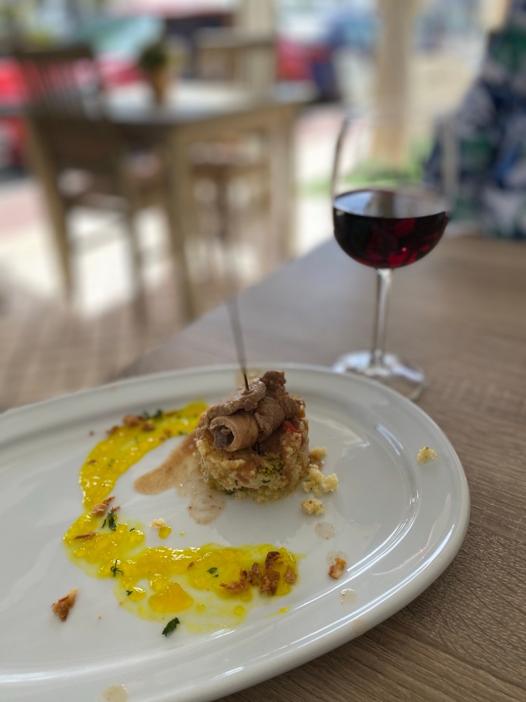 Vägg i vägg ligger Padre Pio. Där fick vi en rullad tillsammans med couscous och en gul sås. Den gula såsen var absolut smaklös. Resten av rätten hade inte heller så mycket smak och detta blev en besvikelse. Synd