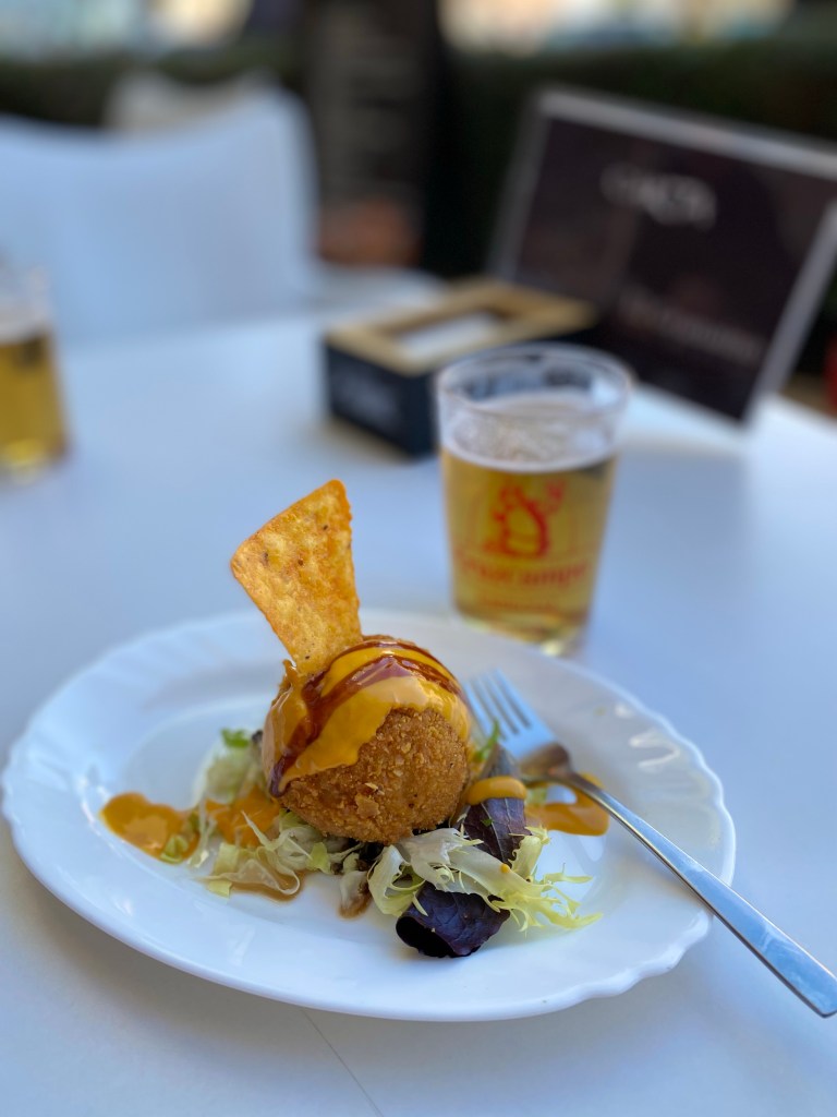 Dagens sista stopp blev på El Granaino. En liten kvarterskrog och våra förhoppningar var inte så höga. Vi serverades en stor krokett med en nacho istucken. Bbq-såsen gjorde att smaken påminde om tacos. Denna tapan var inte på topp men inte heller dålig. Och vi gillade att vi fick en äppelkakebit när vi betalade. Vi är ganska lätt-mutade 😀