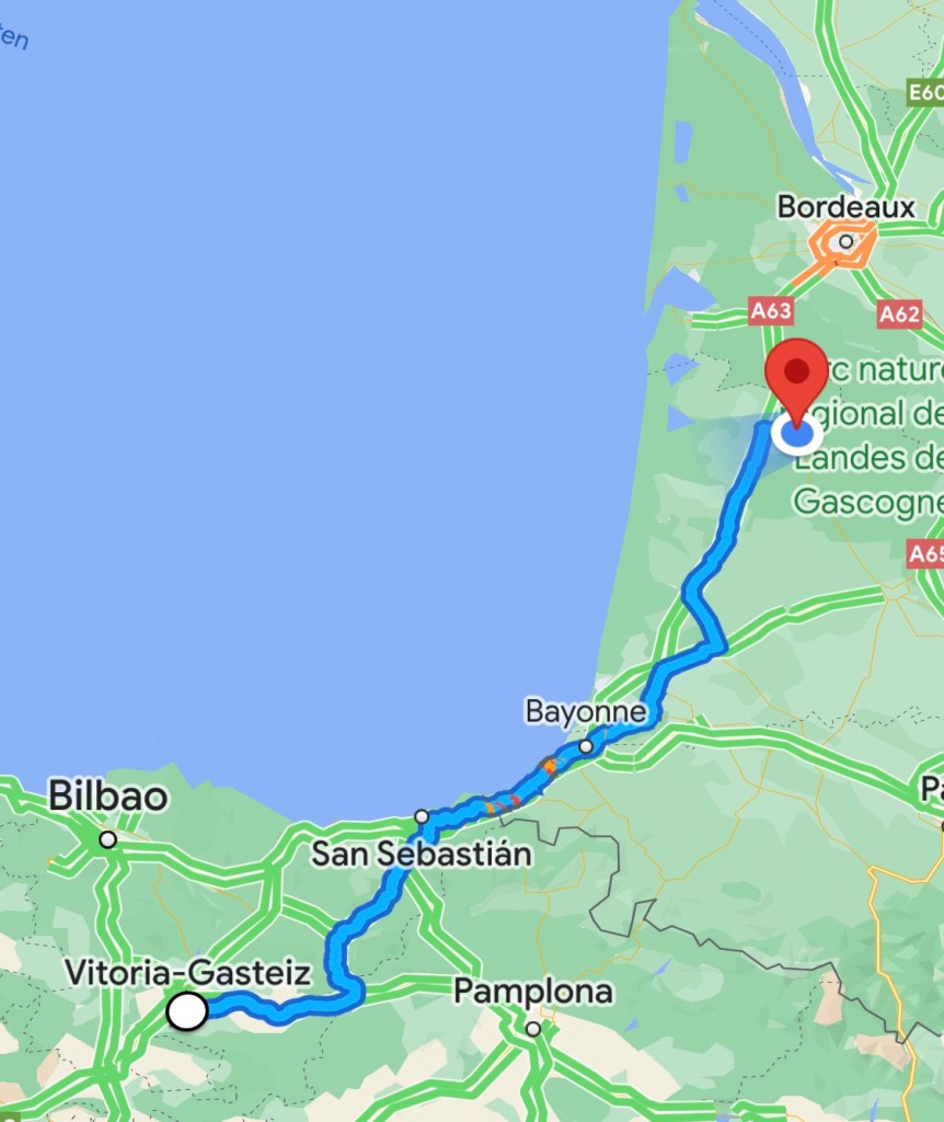 Vi sov jätteskönt i natt och det var kring +4 ute när vi vaknade så värmen fick gå igång. Efter frukost rullade vi vidare mot franska gränsen. Bra flyt, förutom en del köer närmast övergången. Hittade en mack – EasyGas – alldeles vid gränsen på spanska sidan som hade diesel för 1.479 €/lit Det var otroligt effektivt. 3 gubbar servade varsin pump och tankade åt oss.