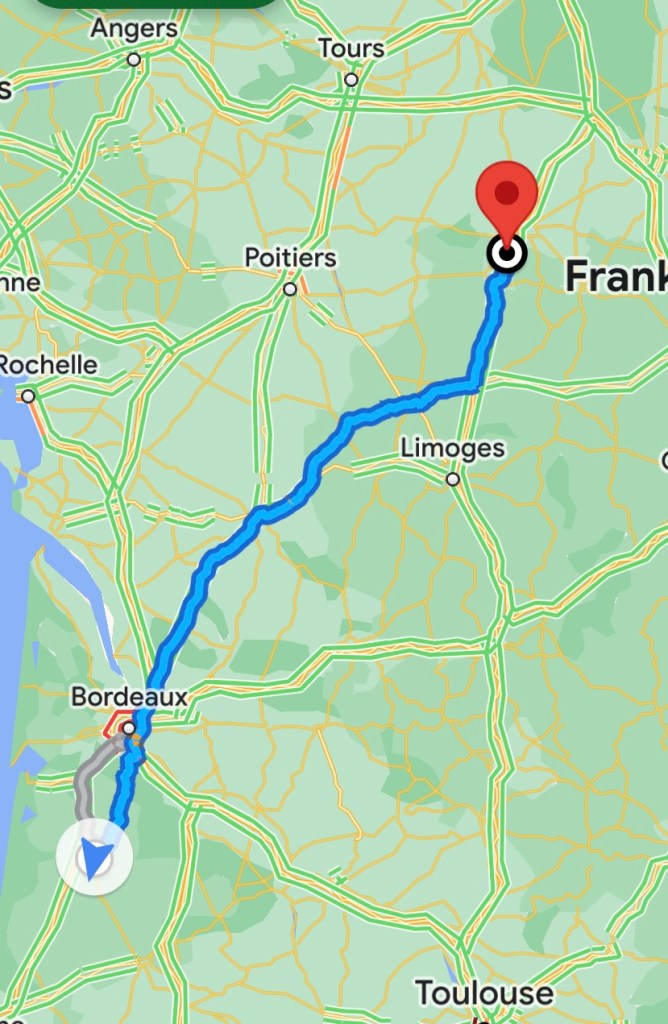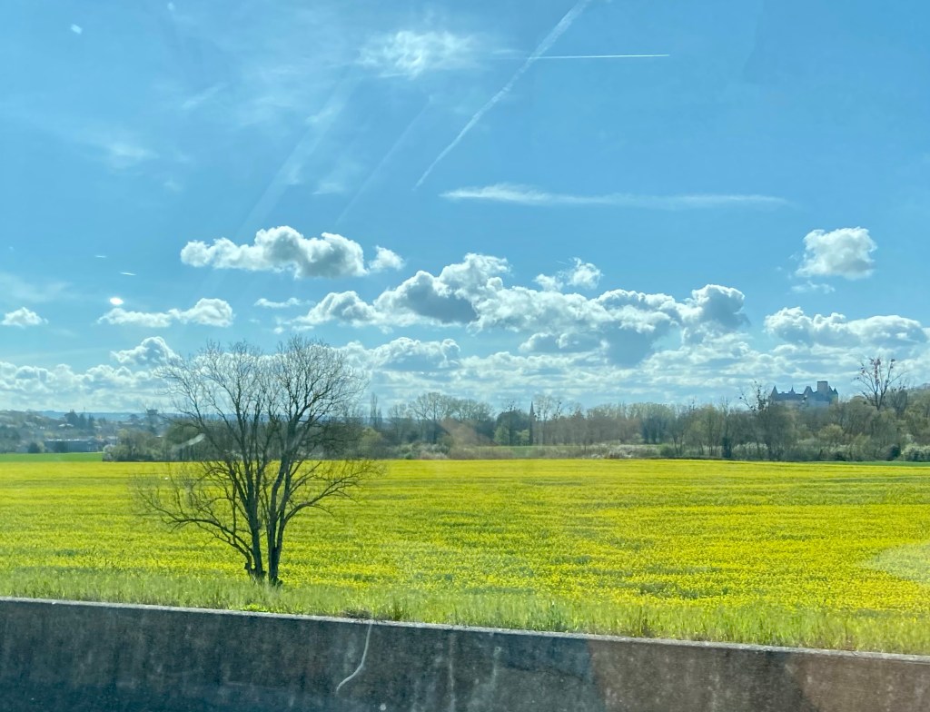 Vi har mest soligt, men en det fula moln sveper förbi emellanåt. Vi har sett blommande rapsfält. Vitsippor. Maskros och gullvivor. Och vägvalet var gratis motorväg/motortrafikled hela vägen. Vi har inte heller märkt nåt av bränslebrist på mackar utan överallt verkar det finnas. Vi tankade på en Intermache-mack och betalade 1.759€/lit