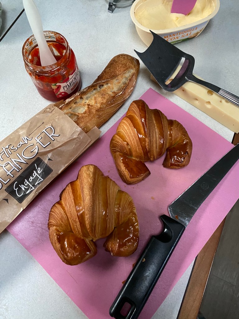 Jag tror det finns en bagare i varje fransk by. Så klart även i Pissos. De öppnade kl 07.00 och jag var förvånad över att det var full kommers mitt i byn. Uppenbarligen är inte långfredagen en helgdag här i Frankrike. Barnen väntade på skolskjutsen, affärerna var öppna. Och vi nöjda med nybakad varm baguette och croissanter. Med dessa godsaker på frukostbordet kan det ju bara bli en bra dag 😉