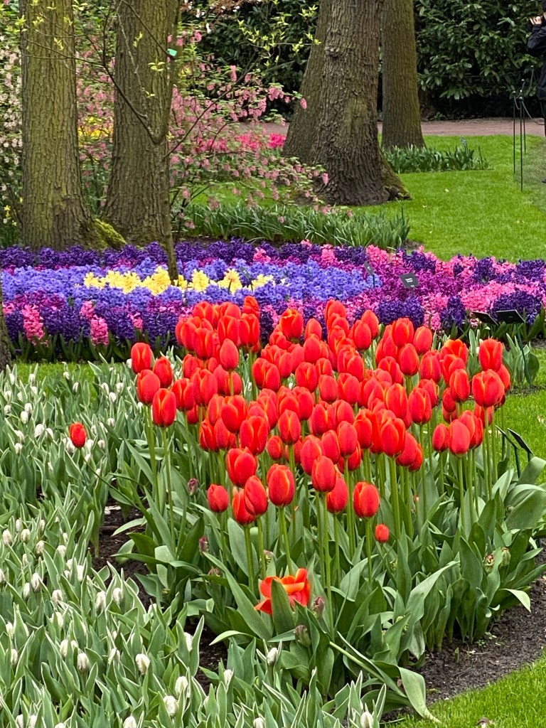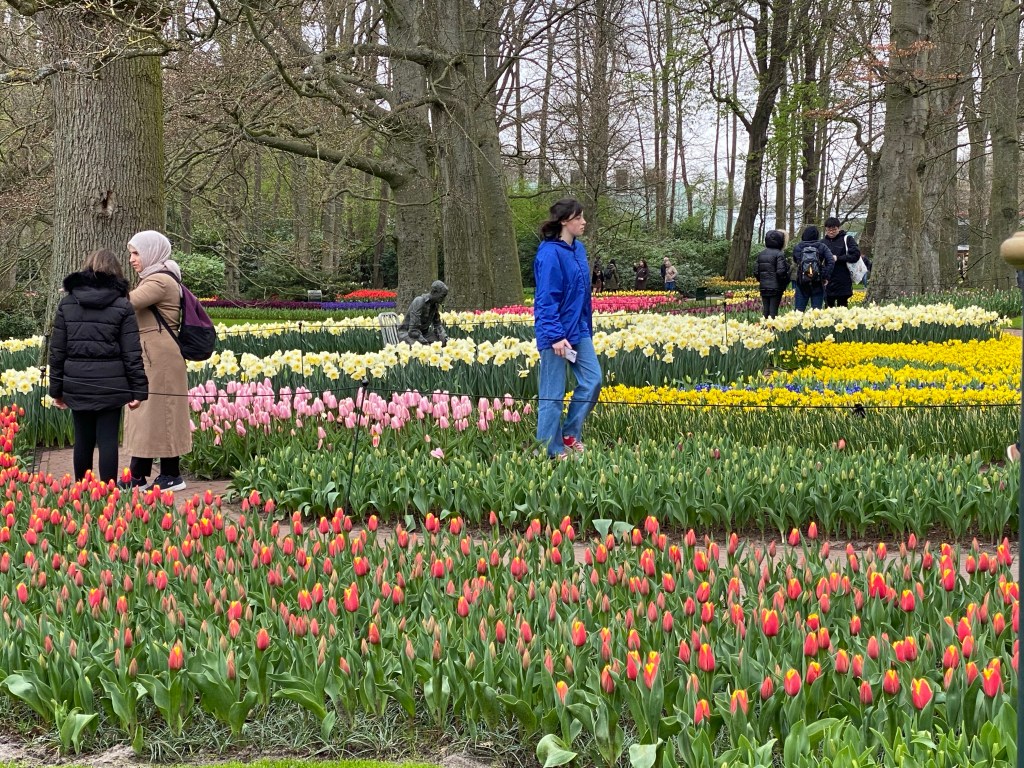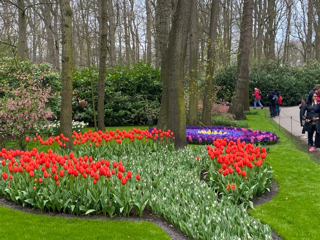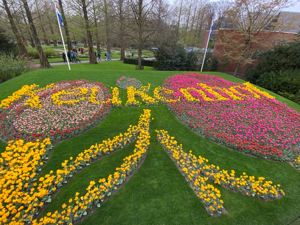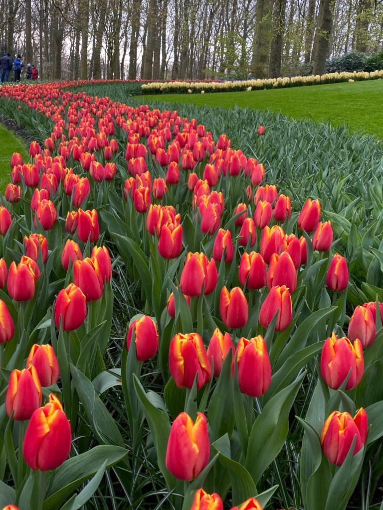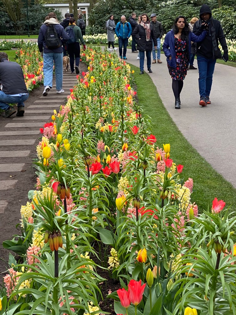 Tulpaner från Holland – det har vi väl alla hört och/eller läst om nån gång. Här finns fält och åkrar som bäst syns uppifrån. Rabatter, odlingar och tulpaner tulpaner tulpaner. Och en hel del andra blommor också. Vi hade bokat biljetter till parken Keukenhof, på nätet innan vårt besök. Just påsken är otroligt välbesökt, då de var skönt att ha det fixat. När vi bokade fick vi välja vilken tid vi skulle komma. Antagligen är det så för att inte trängseln ska bli för stor.