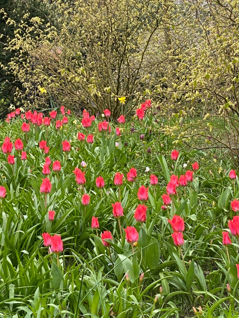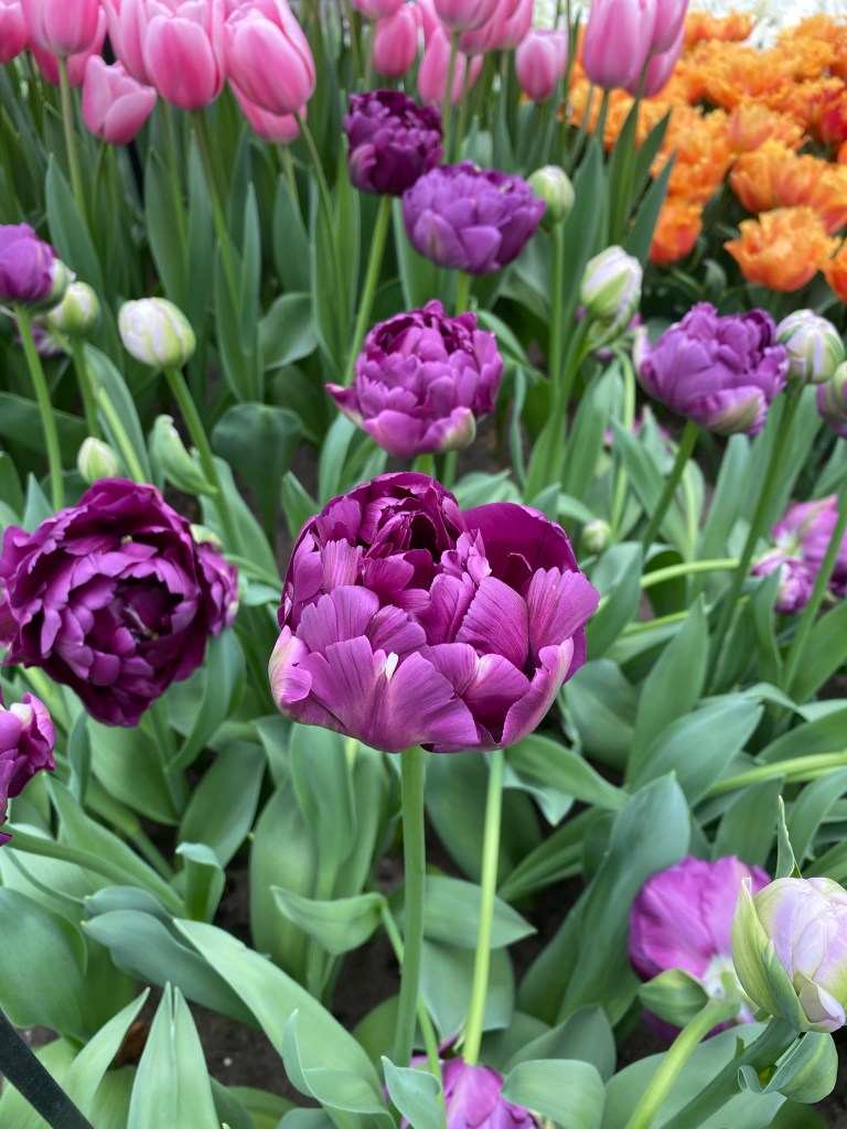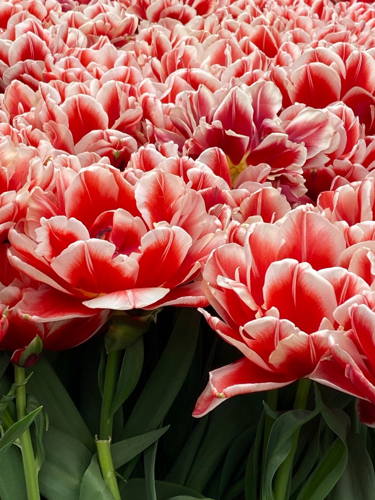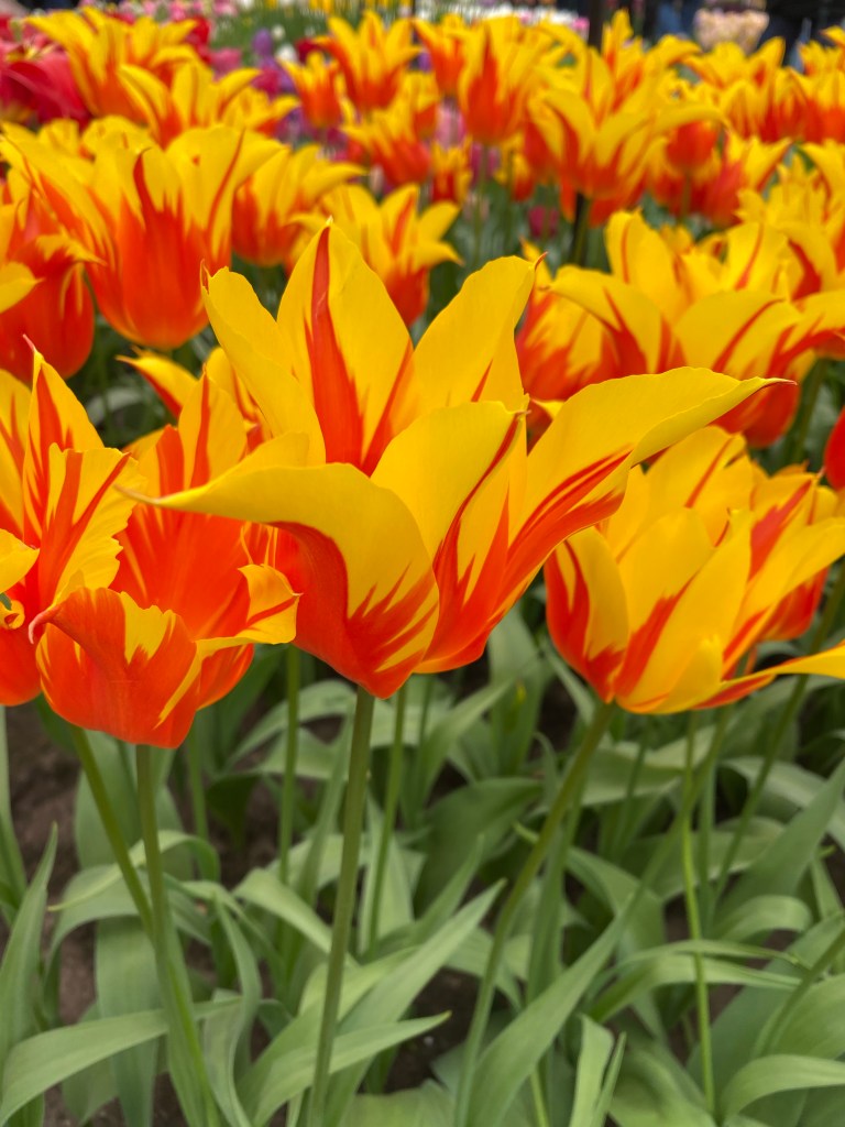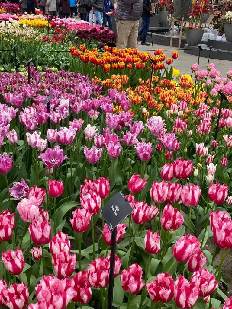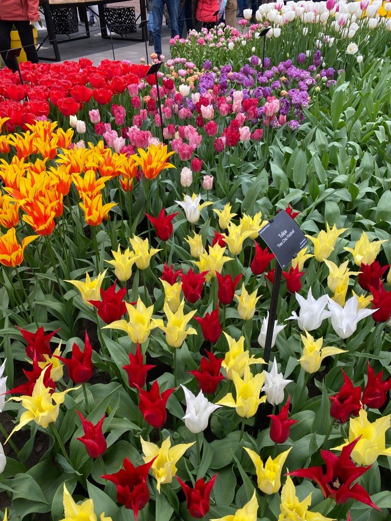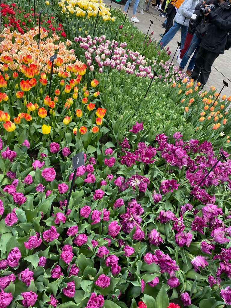 Vid entrén får vi en karta så vi ser hur vi kan gå och vart några ”expon” finns. Vi håller vänstervarv och strosar omkring. Molnen är mörka och vindarna kyliga. Men blommorna skiner som solar så det känns bra ändå. Jag läste nånstans att det finns 6000 (!) olika tulpansorter registrerade. Det är ju några stycken…. Och kanske är hälften planterade här. Eller är det flera? Det spelar väl ingen roll – Otroligt många är det iallafall ! Här nedan kommer nu ett gäng bilder, eftersom jag har svårt att välja bort nåt 🥹 Hoppas du kan njuta av dem och känna dofterna från alla hyacinter
