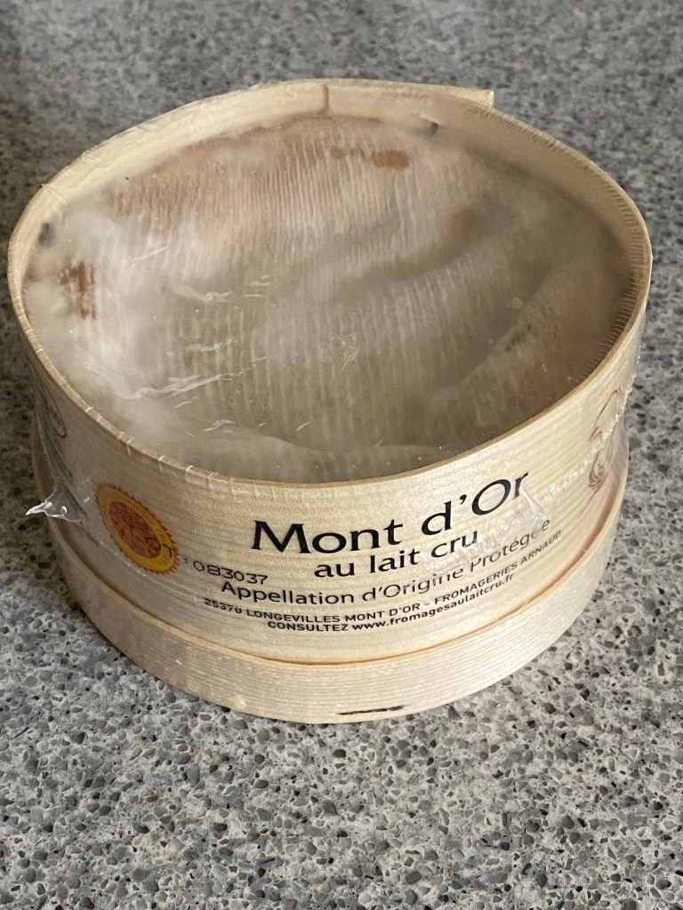 När vi körde upp genom Frankrike lyckades jag hitta osten Mont d’Or. Det är en fransk vitmögelost, från Jura-bergen och tillverkas endast från augusti till mars. Mont d’Or är AOC-klassad och ligger i en ask av gran.