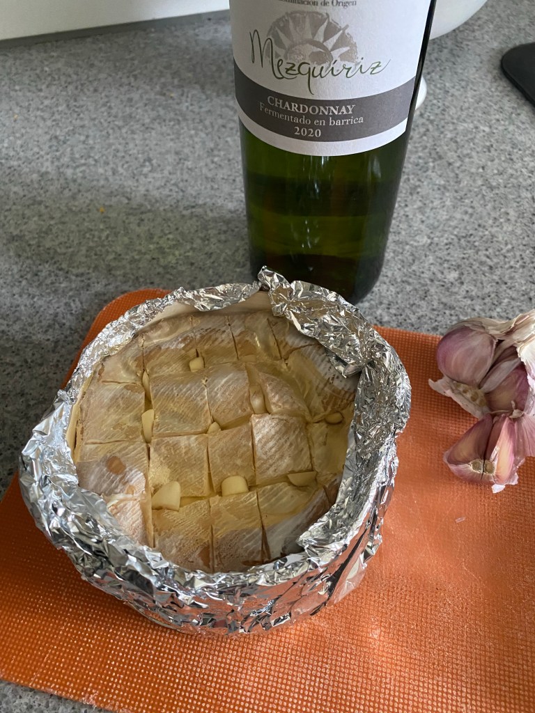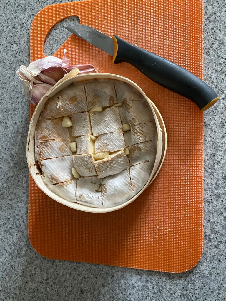 Den här osten ska bli en liten ostfondue. När den är dags att tillaga tar man av plasten, och klär in spånasken med aluminiumfolie. Skär ett kryssmönster eller gör små hål på ovansidan av osten. Där trycker jag ner vitlök och lite vitt vin. Knappt en halv deciliter, skulle jag tro. Sedan bakar man osten i ugnen i 200 grader 20-30 minuter om den kommer direkt från kylskåpet. Har den stått framme en stund räcker det med 15-20 minuter i ugnen.