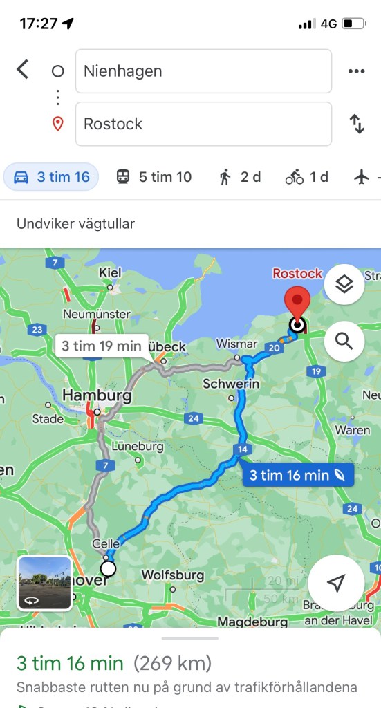 Efter lite tankning och shopping styrde vi till Nienhagen. Det ligger strax söder om Celle. Vi förstod att det skulle vara fullt när vi kom. Men på parkeringen precis bredvid var det helt tomt, så vi stod där. En riktigt god pizza inhandlades och vi slappade bara. Vi hade 27 grader när vi kom dit… 27 mil blev dagens etapp och ställplatsen kan du hitta här N52.5568626, E10.1071768