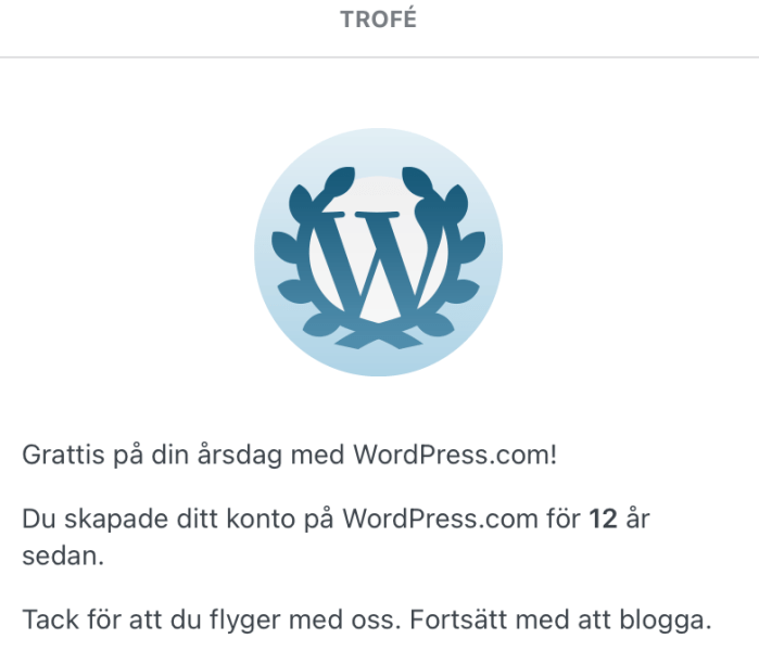 I morse fick jag en trofé från WordPress. Tydligen är det 12 år sedan jag skapade ett konto på WordPress. Vilken tur de håller reda på det, för jag hade inte en aning :p