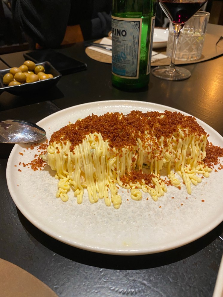 Bord hade vi bokat, för det är en liten restaurang. Vi blev mycket väl mottagna och visade till vårt bord. Kyparen frågade om vi varit där på middag förut och det måste vi ju svara nej på. Så han berättade om deras rätter och om deras koncept. Det är vanligt att man beställer in rätter och smakar av varandra. Vi fyra började med att dela på en Ensaladilla Rusa con jamón. Otroligt gott och med skinkan ovanpå, som är alldeles krispig, blir det så bra ihop.