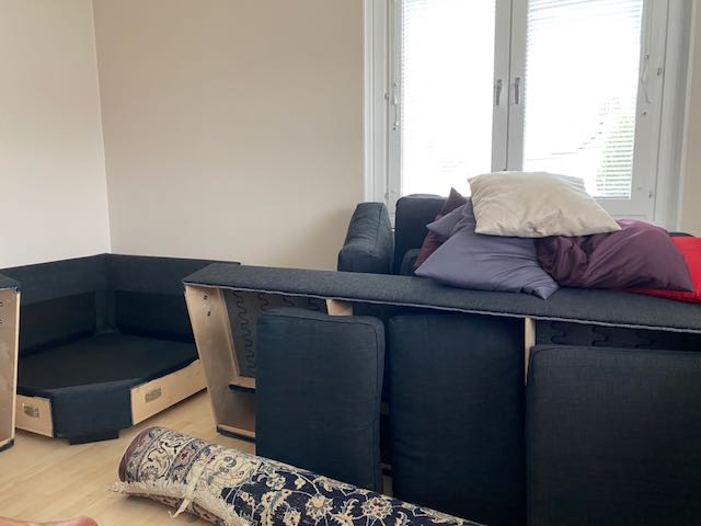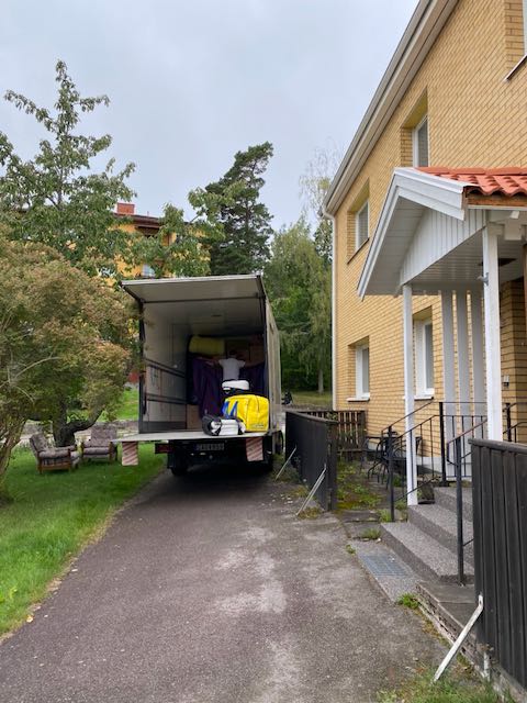 Möbler skruvades isär och så var flyttdagen här. Kl 8 kom flyttkillarna och de hade 3 mindre lastbilar att stuva i. Och det blev fullt. Och en hel del körde vi själva i husbilen också. Rackarns vad med grejer en spar! Nåväl. Vi hade faktiskt tur med vädret. Det var uppehåll när bilarna packades. Det regnade rejält utefter vägen till Mockfjärd. Men väl där var det uppehåll igen. Snacka om tajming. Ida kom och hjälpte oss. Görans son Daniel och de äldsta barnbarnen Albin och Morgan kom och hjälpte till att skruva ihop möbler. Idas man (som också heter Daniel) och småprinsarna kom med pizza och goda bakverk. Och våra vänner Åke och Ingegerd kom också och hjälpte till.