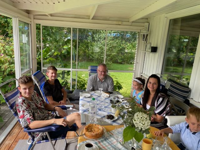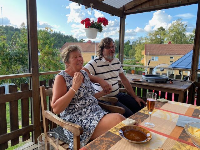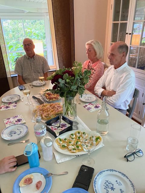 Innan augusti tog slut hade vi ett ”riktigt ” kalas för Göran. Vi hade alla tre barnen och familjerna hemma på mat och fika. Och tänk att alla fick plats på vår nya altan. Cateringmaten hade vi tagit från Flo´Kulllornas Kök i Dala Floda. Fantastiskt gott! Och väl tilltagna portioner så vi fick njuta av maten flera dagar. Vi hann också med att få besök av både Forsbergs och Gylls. Så perfekt att de kom olika dagar och att de också fick plats på vår uppfart med sina husbilar.